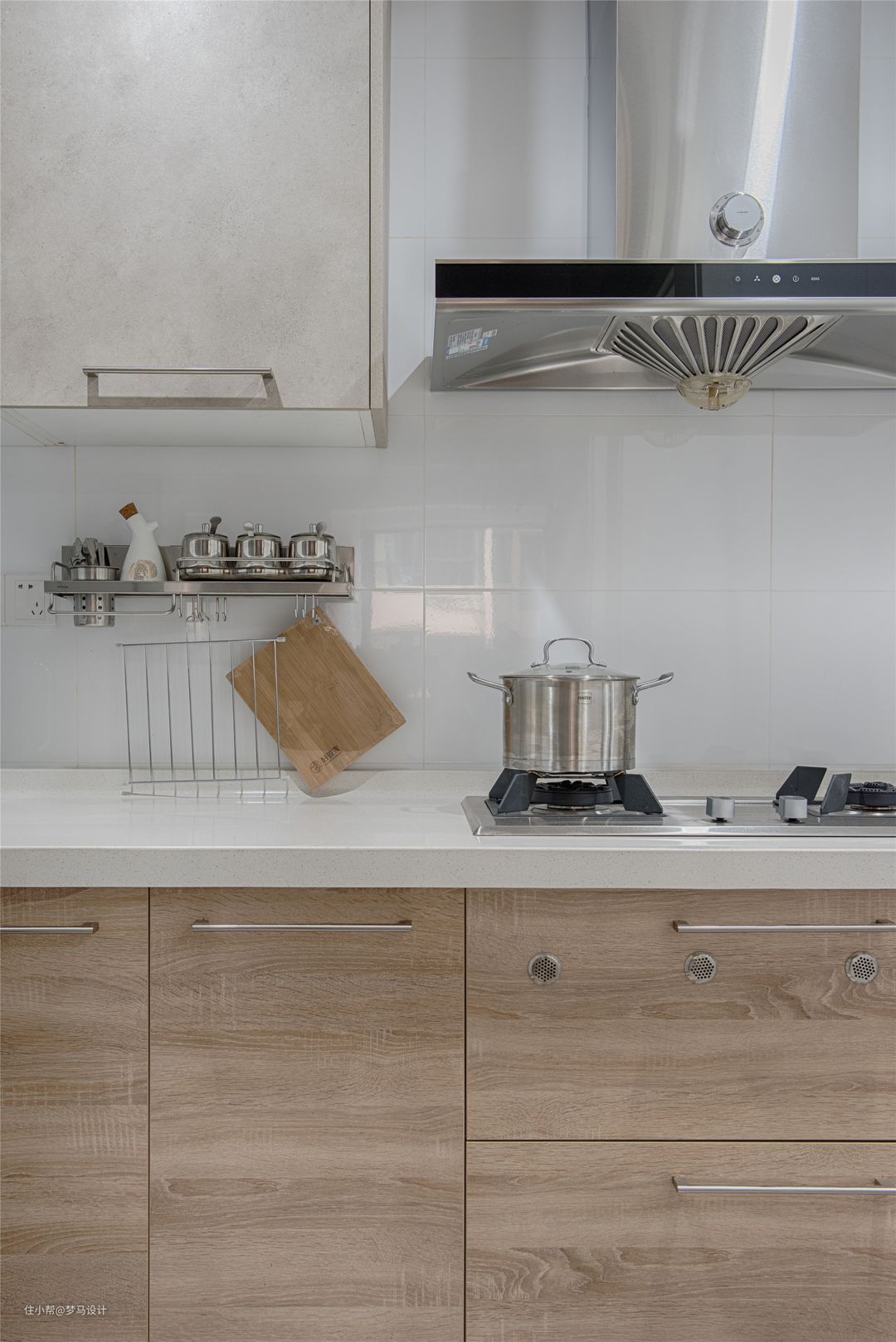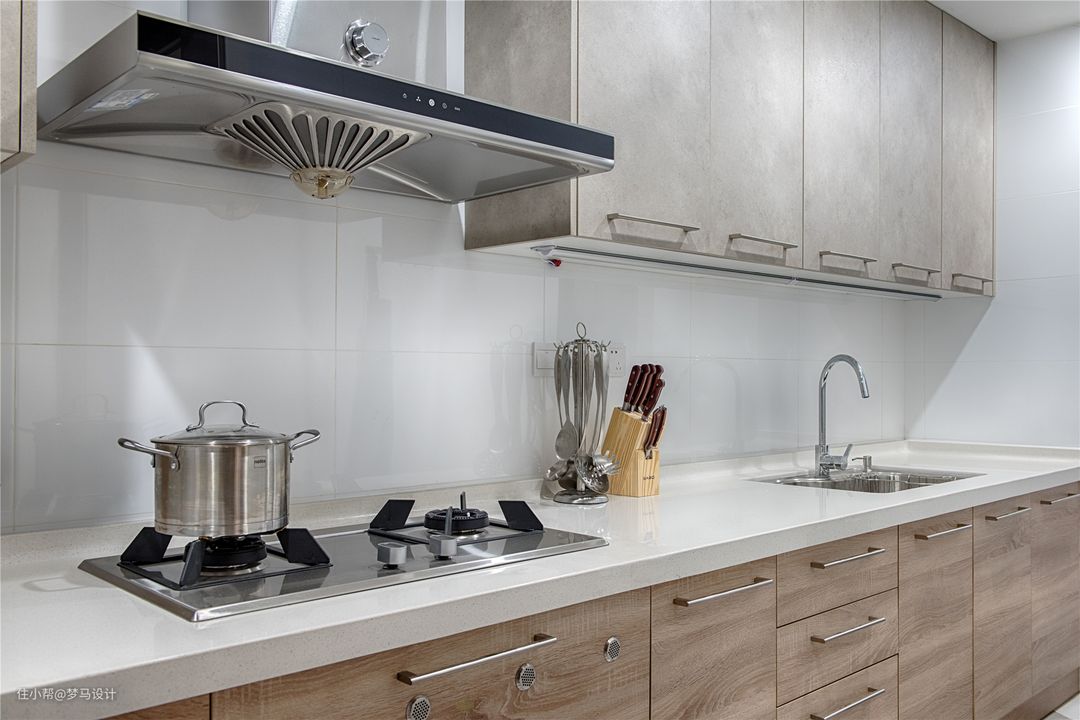 ▼厨房,生活气息最浓郁的地方,一家人团聚,炊烟袅袅,半开放式厨房,拉长了烹饪空间,缩短了与家人交流互动的距离。白色的墙面与白色的操作台面干净整洁干练,原木色柜体提升心里的温度,白色亮光砖无形扩大了空间美感,也美化烹饪时的心境。