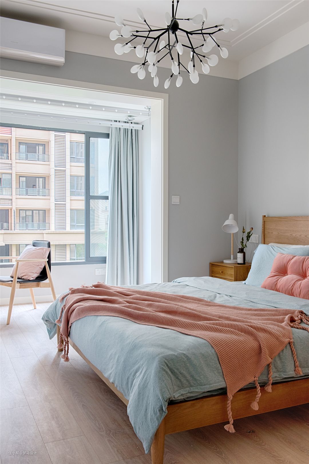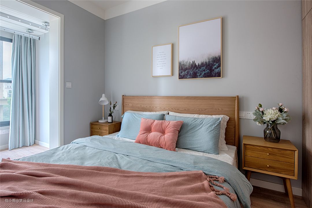 ▼卧室以灰色白色为基色,居室清新淡雅。搭配蓝色粉色软装饰品调和,心里的温度回升。而要数最温暖,必定是无论从视觉上还是触觉上都很舒服的原木大床。