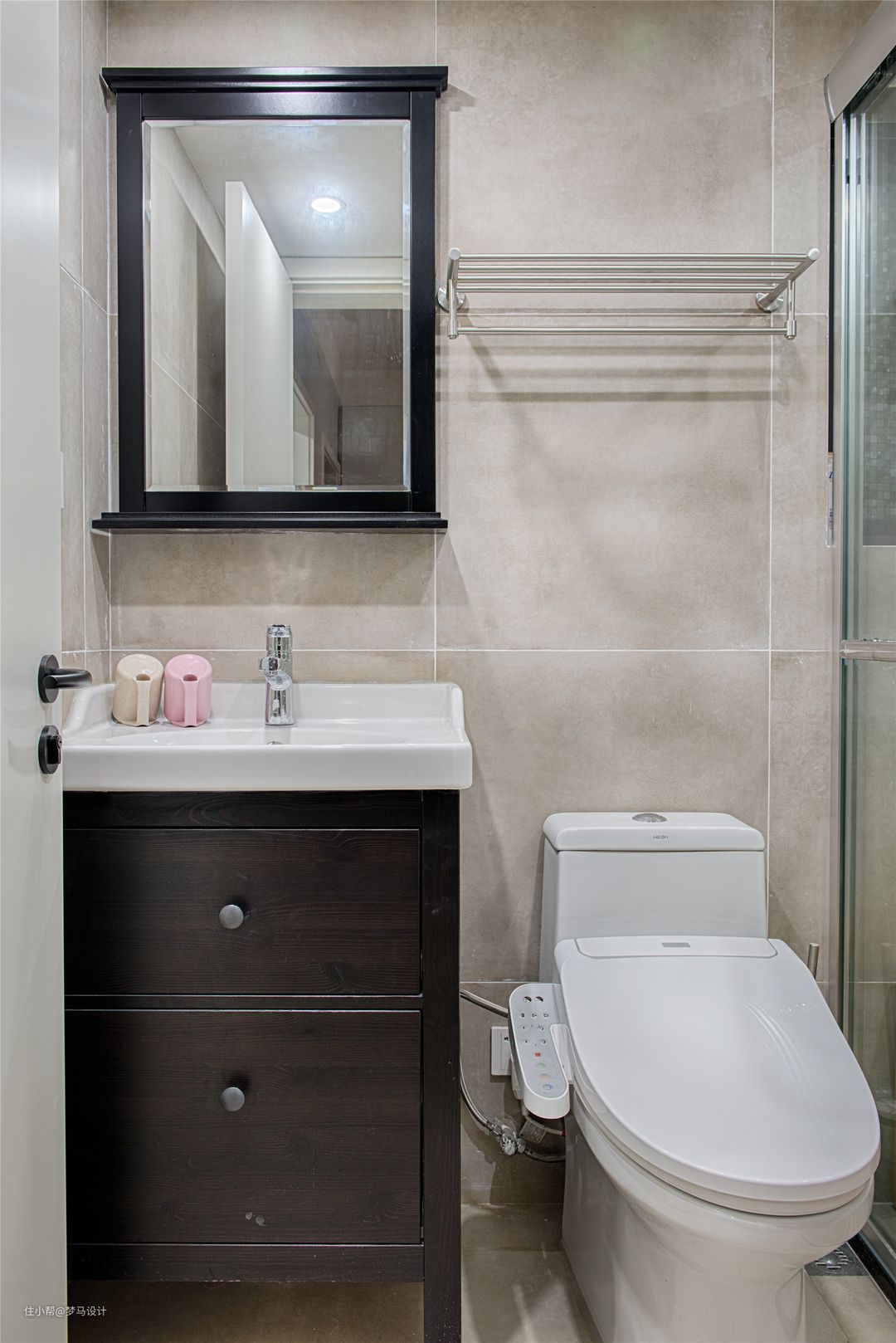 ▼卫生间小巧但五脏俱全,黑色的浴室柜、黑色的浴室镜框,精致干练,马桶上方设置毛巾架,不浪费一丝空间。