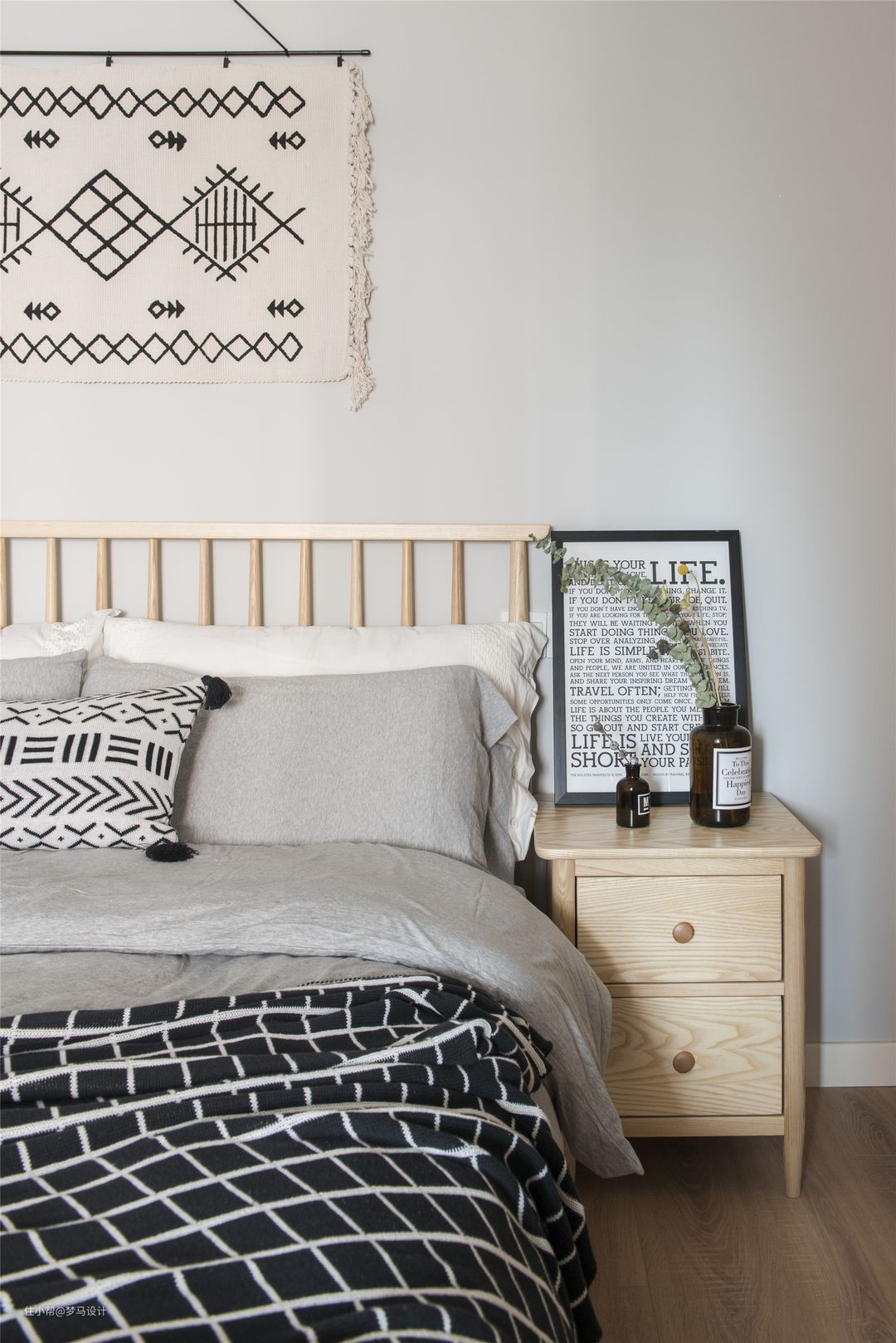 ▼与主卧同行色的顶 墙,搭配不一样的床品有了别样的味道,几何图形的装饰充分表达了北欧韵味。大面积的留空给人以无限遐想,小小的摆饰也有了特有的味道。