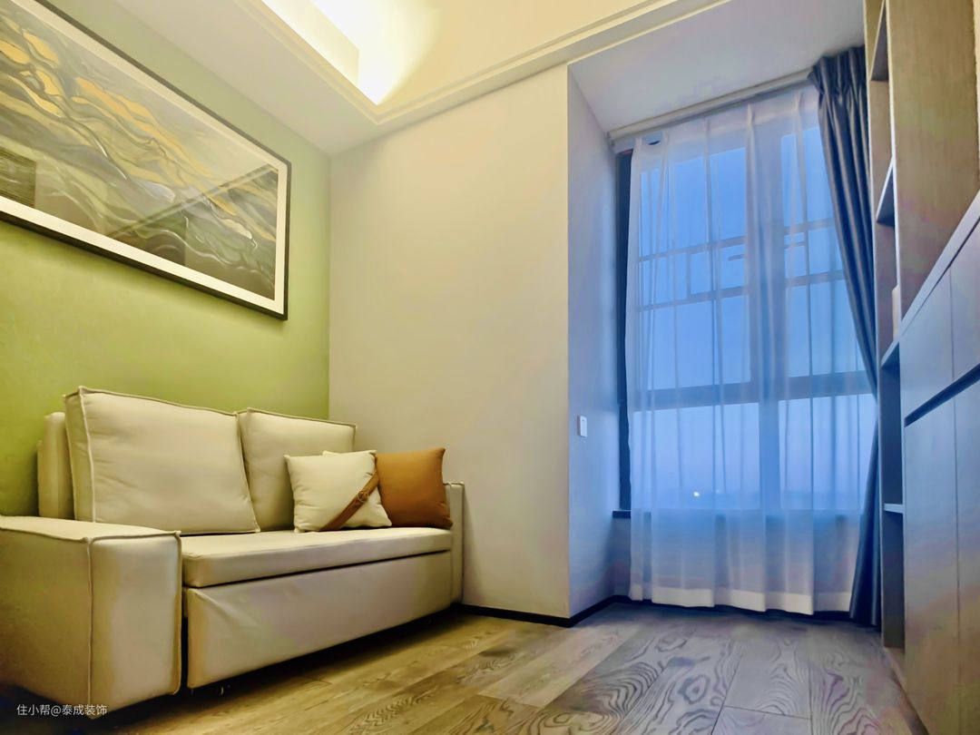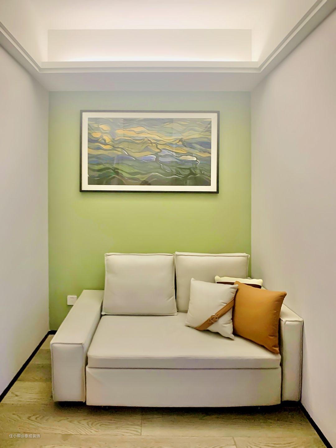 与吧台相邻的是一间小书房。房间空调挂机隐藏得恰到好处,不注意看根本发现不了。 女主人特别挑选的折叠沙发床,软硬适度,完全可以满足睡眠之需。而这背后的画,是刘生亲手所绘。