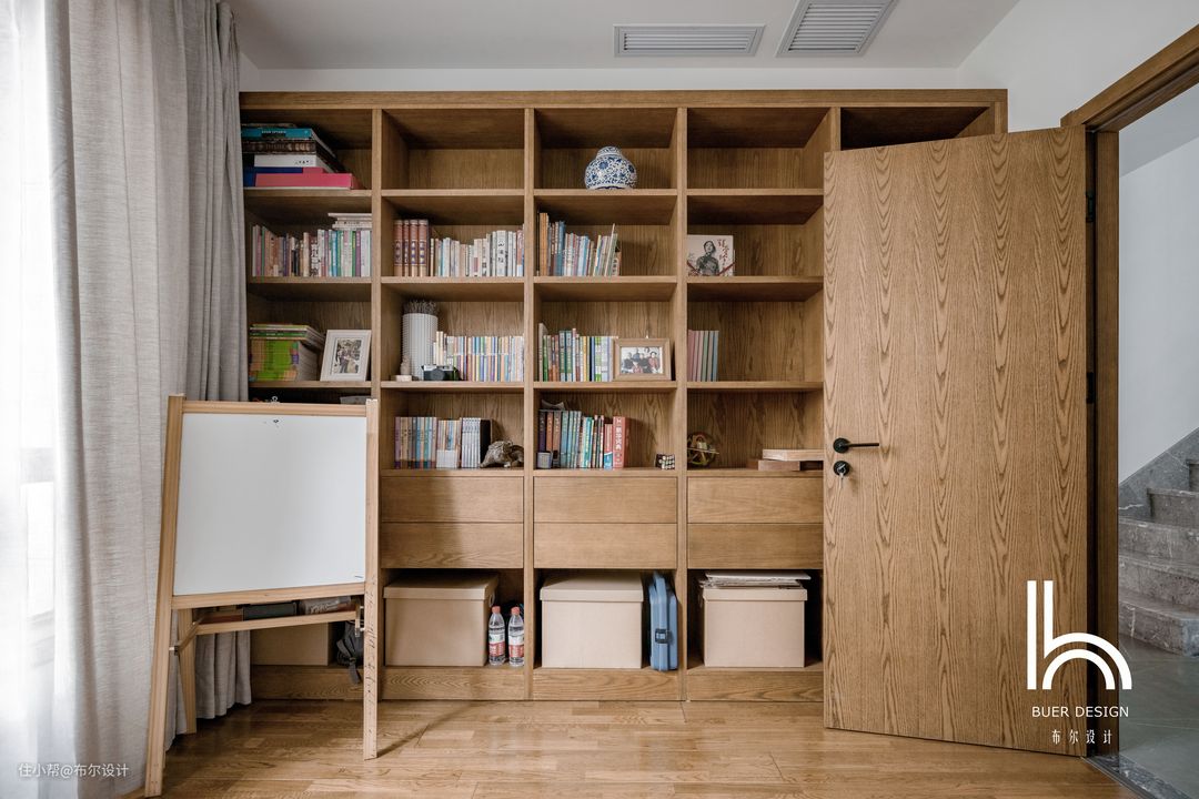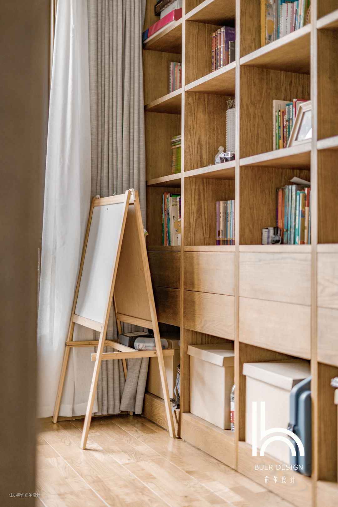同原木色的风格让整个空间统一,整个书房没有采用常规的大书桌,而是使用了相对较小的书桌,方便小朋友学习画画。