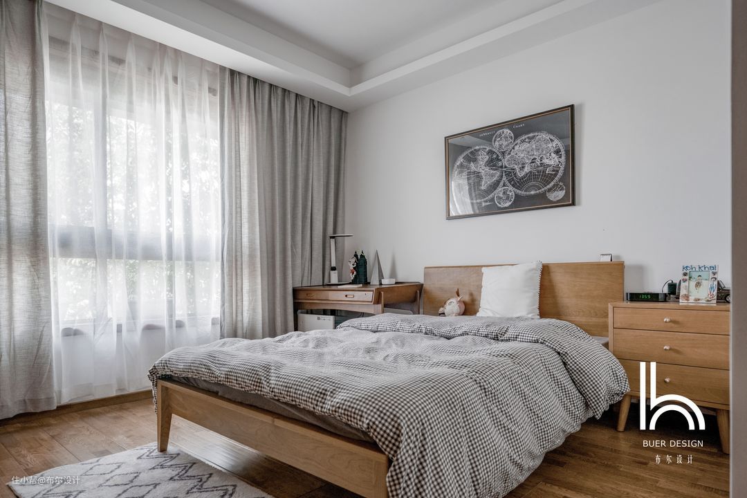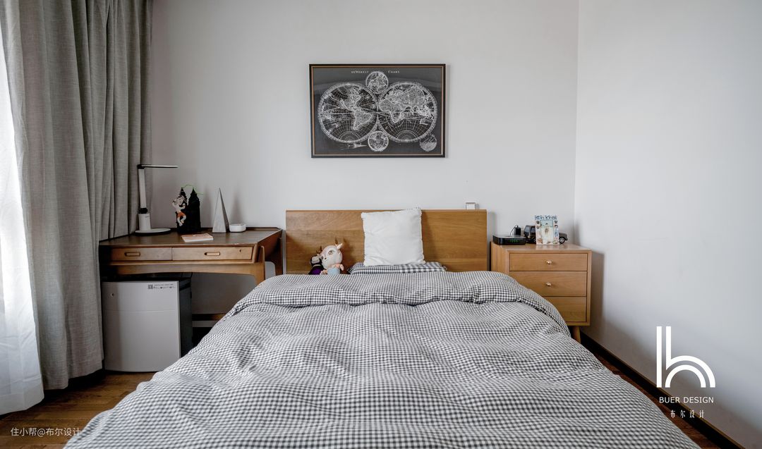 儿童房采用简洁明了的设计,把常用的书桌放在床边。墙上的画让整个空间充满了童趣;阳关透过窗帘传来,整个空间变得明媚。