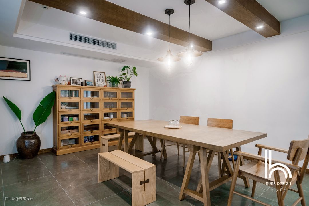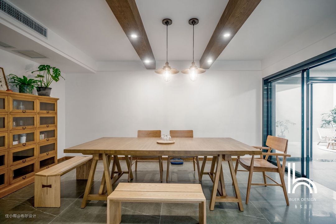 透明的落地窗能够很好的隔绝厨房的气味,原木的吊顶加上灯光让整个餐厅充满了温暖;没有常规的全部采用靠背的椅子,而使用了两个长凳,增添了别样的乐趣。