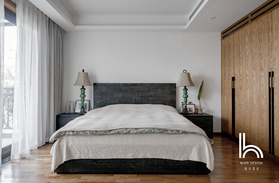 床没有使用原木,而是采用和柜子门把手一样的颜色,让整个空间看起来更加协调;两个带有一点复古的落地灯,给整体增添了色彩。