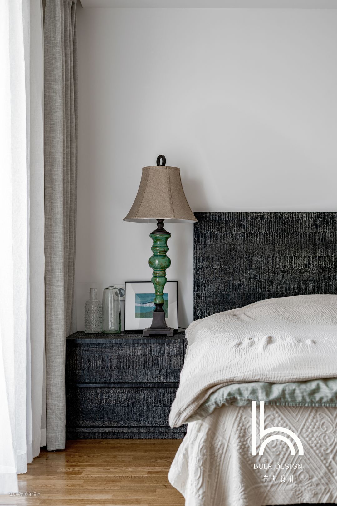 床没有使用原木,而是采用和柜子门把手一样的颜色,让整个空间看起来更加协调;两个带有一点复古的落地灯,给整体增添了色彩。