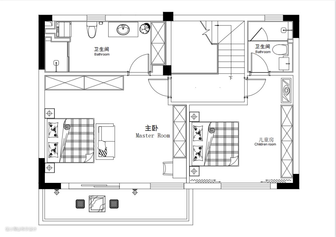 儿童房采用简洁明了的设计,把常用的书桌放在床边。墙上的画让整个空间充满了童趣;阳关透过窗帘传来,整个空间变得明媚。