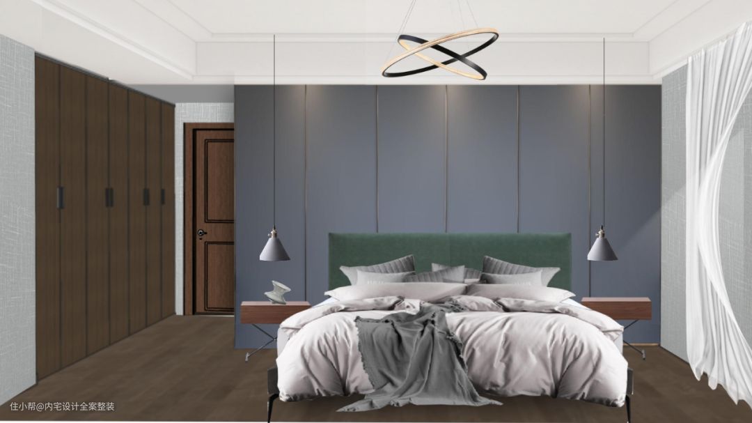 考虑到预算问题,主卧空间没有做复杂的造型,背景墙选用深灰色墙咔做简单设计,搭配水泥材质小吊灯提升空间质感。