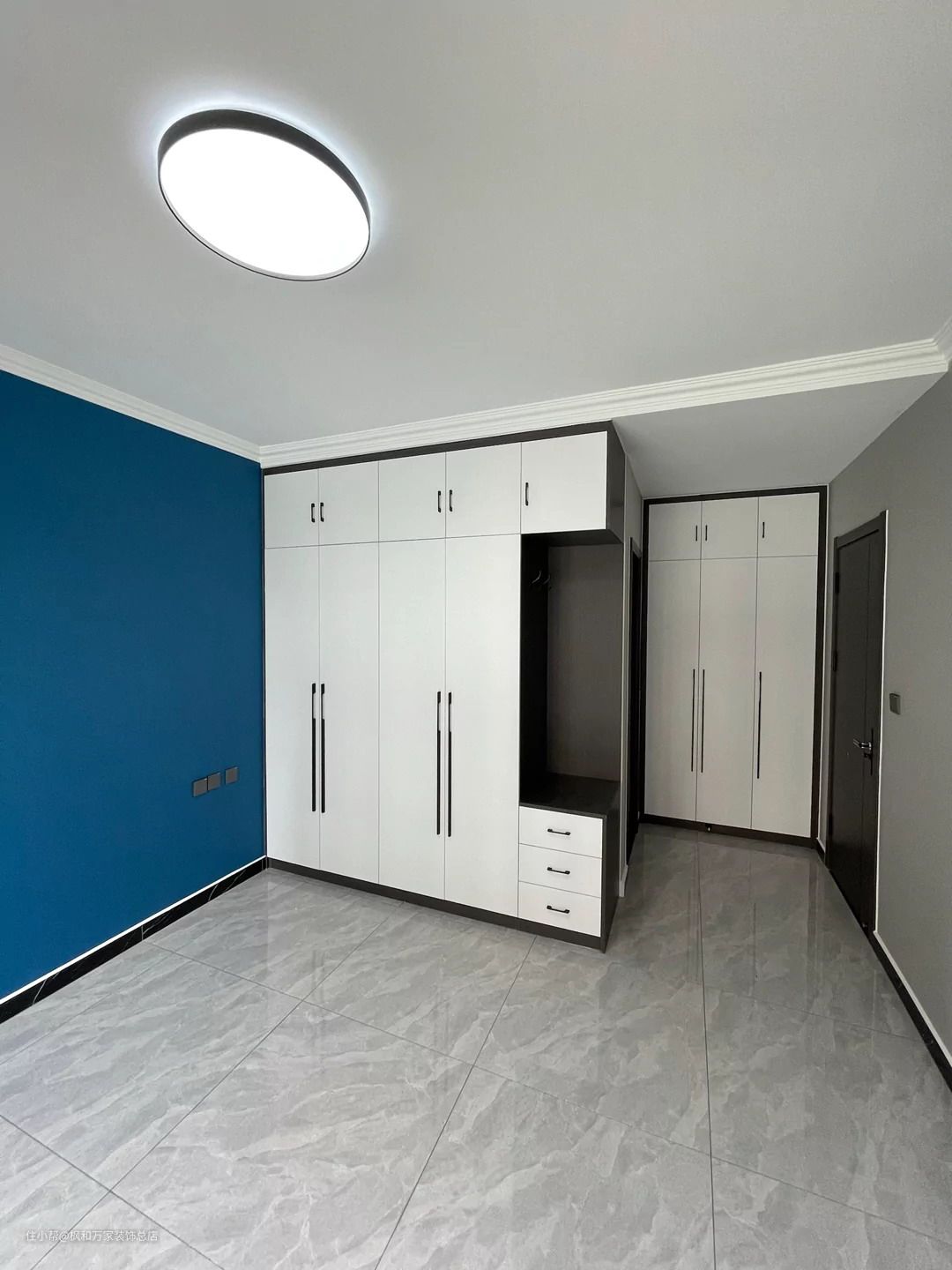 地面是全屋地砖通铺,不做过门石效果更好,床头背景刷了当下最流行的孔雀蓝跳色,通顶衣柜进门位置做了转角衣横更实用满足各种收纳。