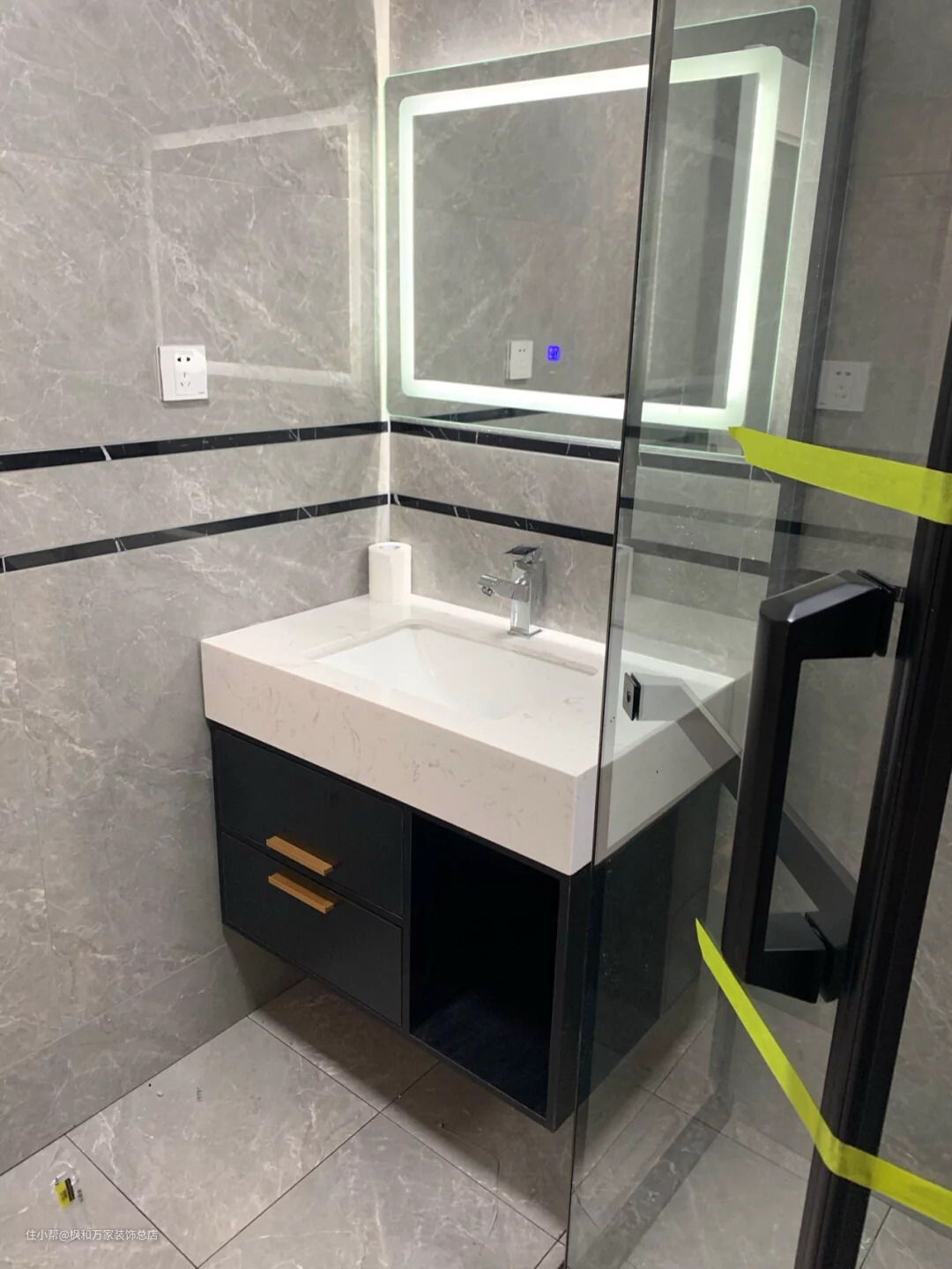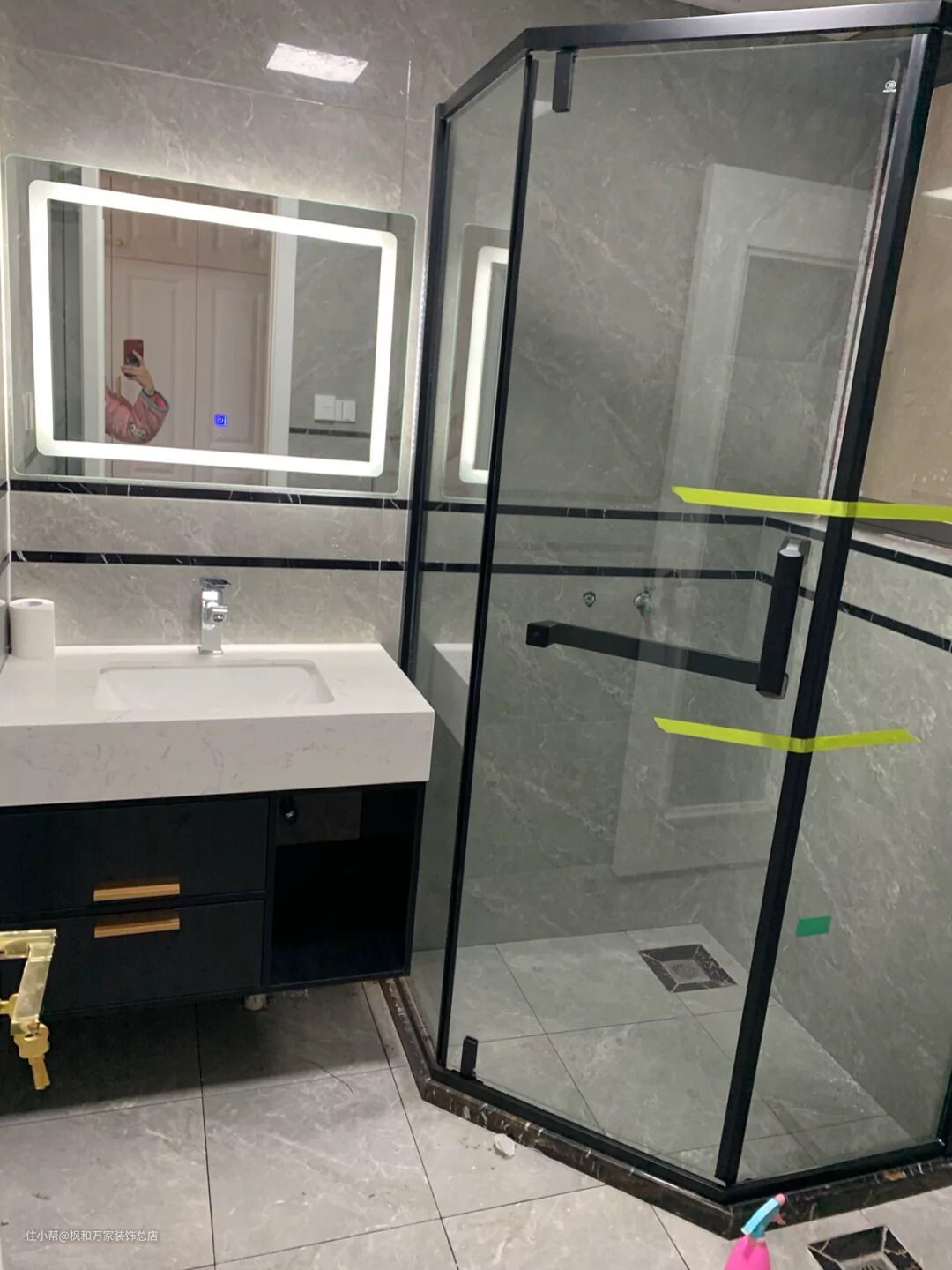 卫生间以黑灰为主,岩板洗手台配合智能镜,做钻石型淋浴间空间不打架。