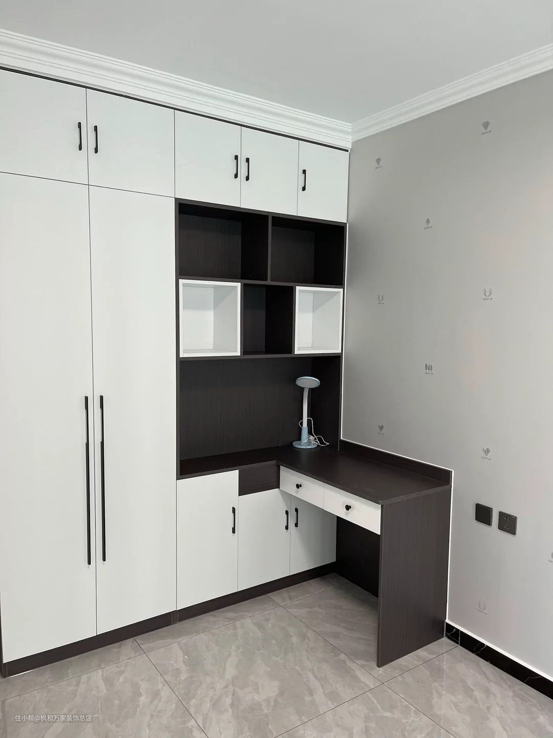 主卧室做通顶衣柜,上方吊小平顶跟整屋石膏线无缝衔接,衣柜设计小书桌省桌床头柜也可以解决的空间小衣柜打不开柜门的尴尬。