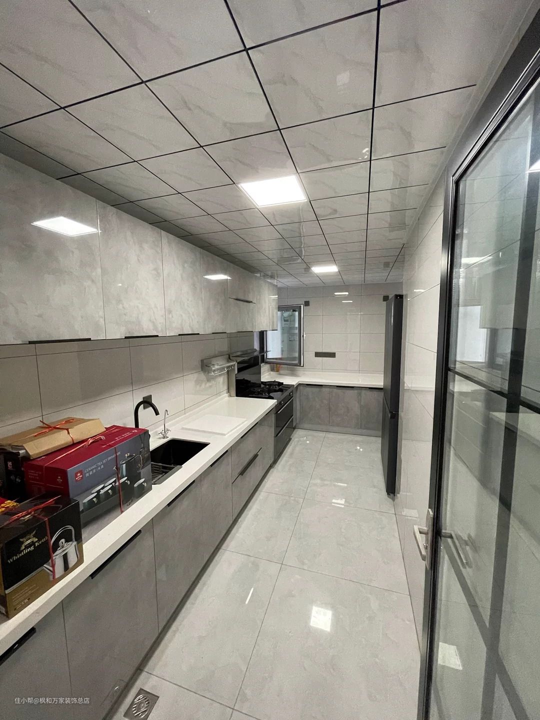 厨房用300*300铝扣板吊顶防水防潮方便维修,L型橱柜保证操作台上空间和收纳空间,高光柜门后期更容易打理。洗菜做台下盆防止卫生死角。