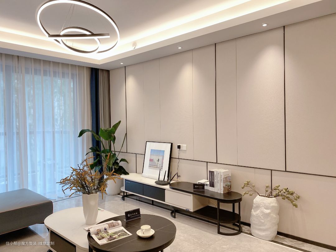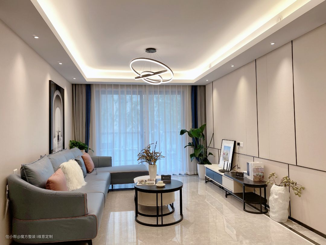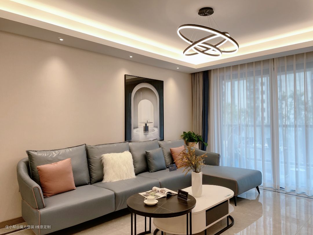 科技布材质沙发+岩板组合茶几+LED灯具+窗帘+软装饰品