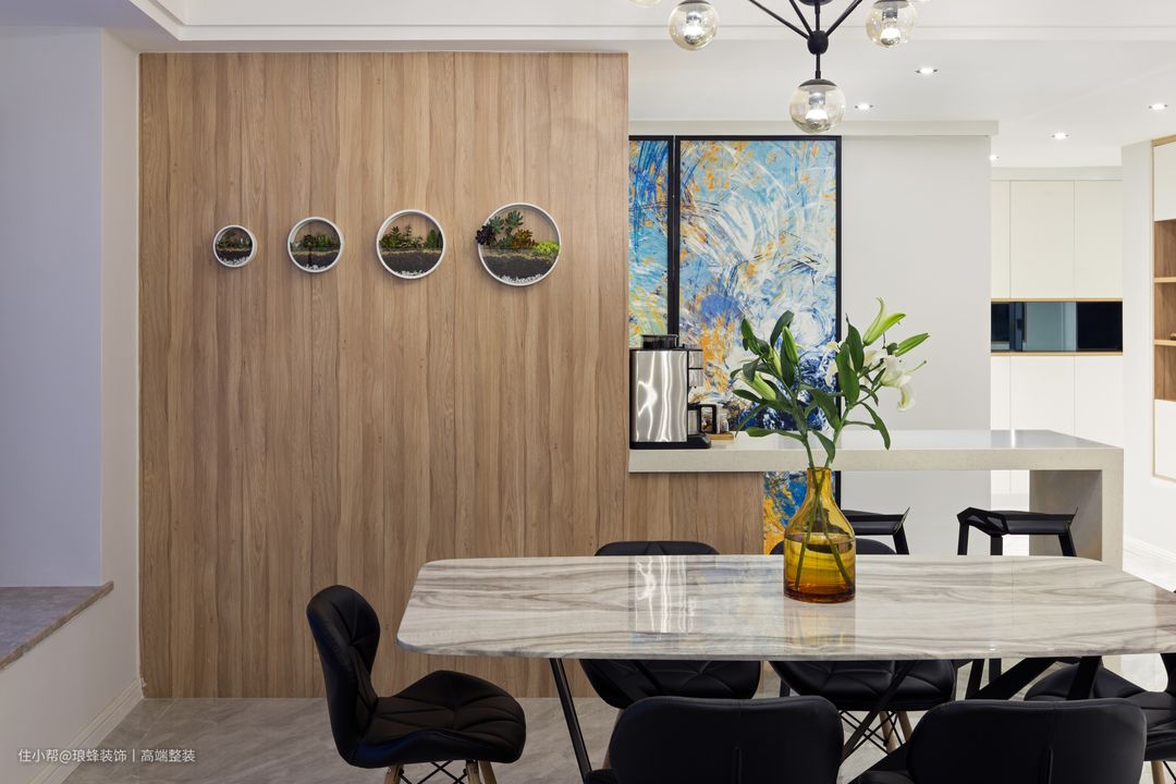 中厨的推拉门,是设计师别具匠心的设计,门面是定制的油画画面,兼具美观和实用。