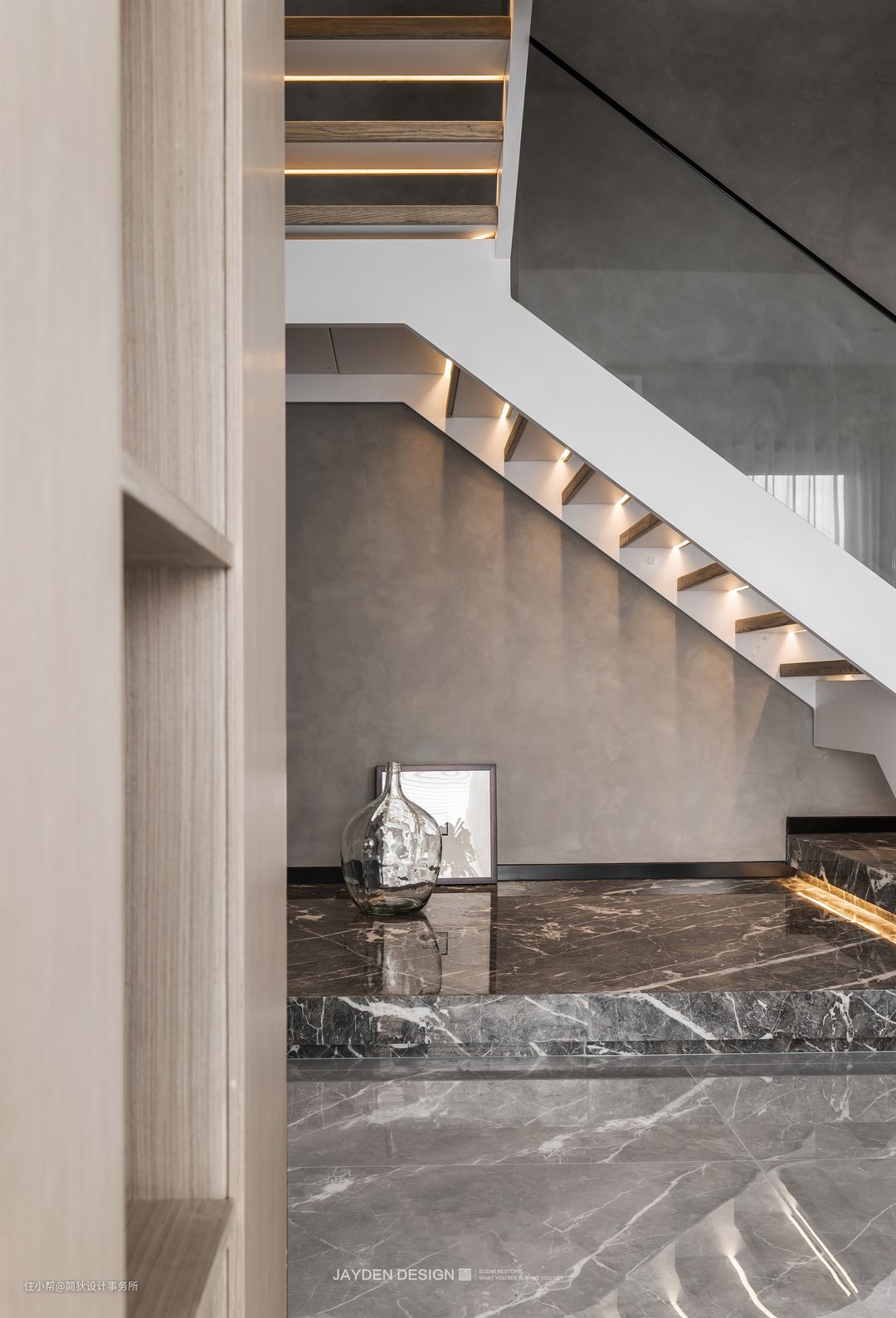 楼梯设计是全屋的核心,同时也是连接上下两层空间的功能和颜值担当。大理石、木材、玻璃和金属材质被完美的结合,相得益彰。起始层设计为整块的大理石地台,第二级为面积较小的大理石叠层,从第三级开始为木质踏板。为了让楼梯视觉上更加轻盈通透,整体采用钢结构、镂空的踏板加玻璃扶手的设计,辅以氛围灯光的烘托,打造出晶莹剔透的动感效果。