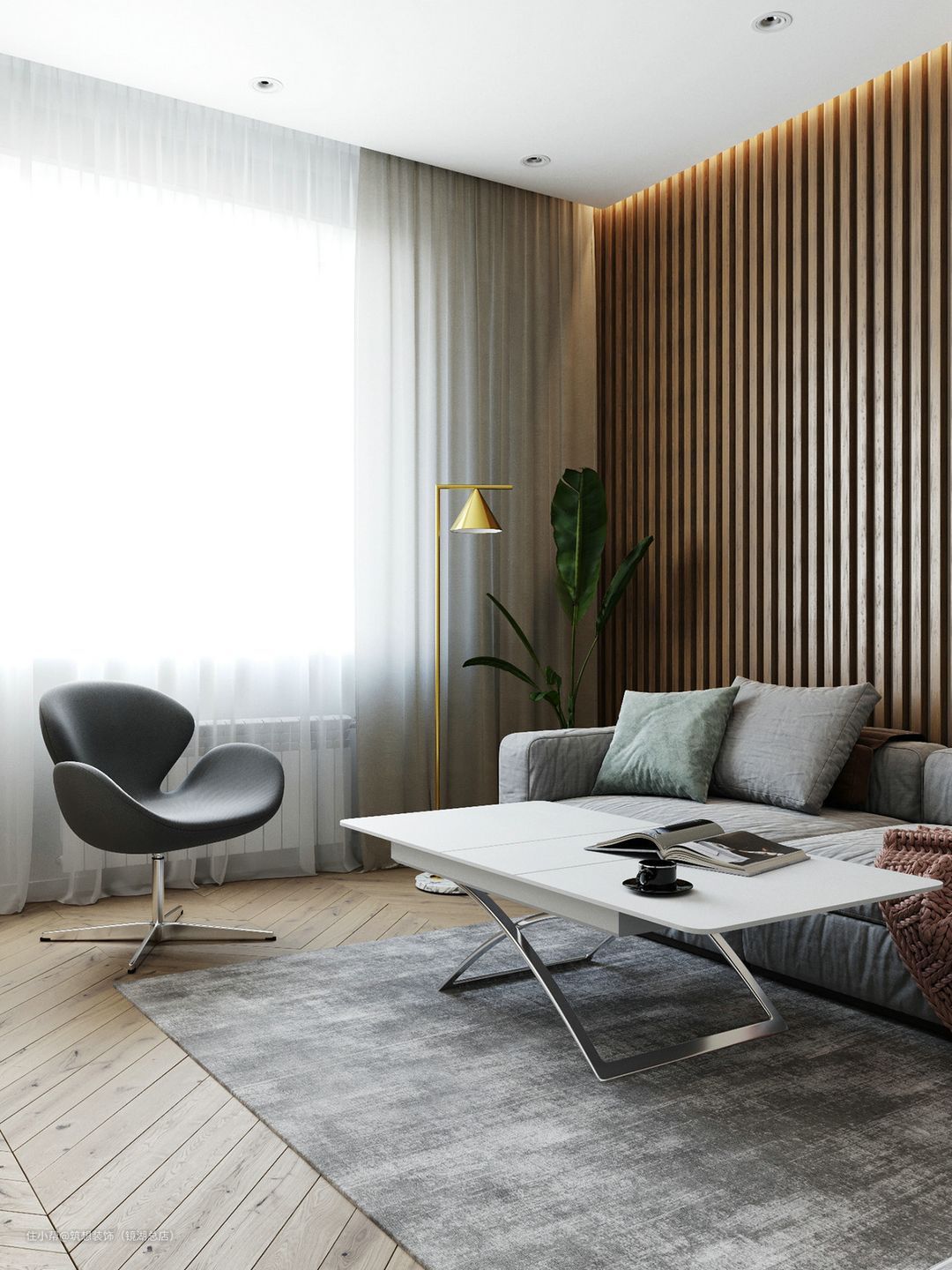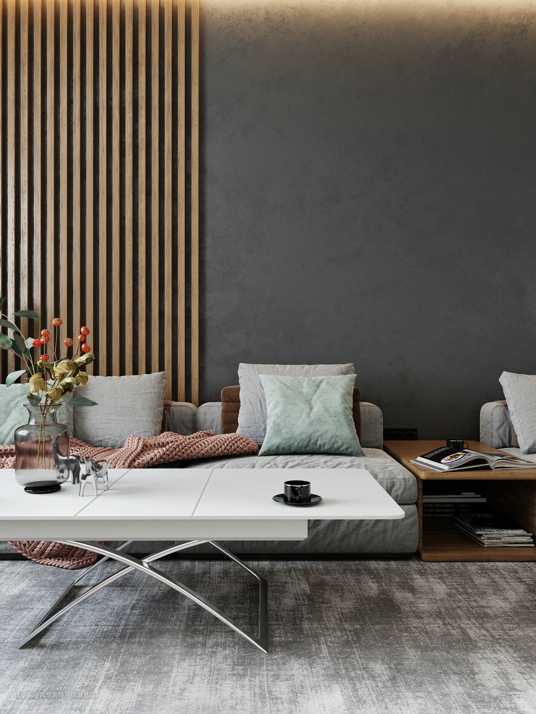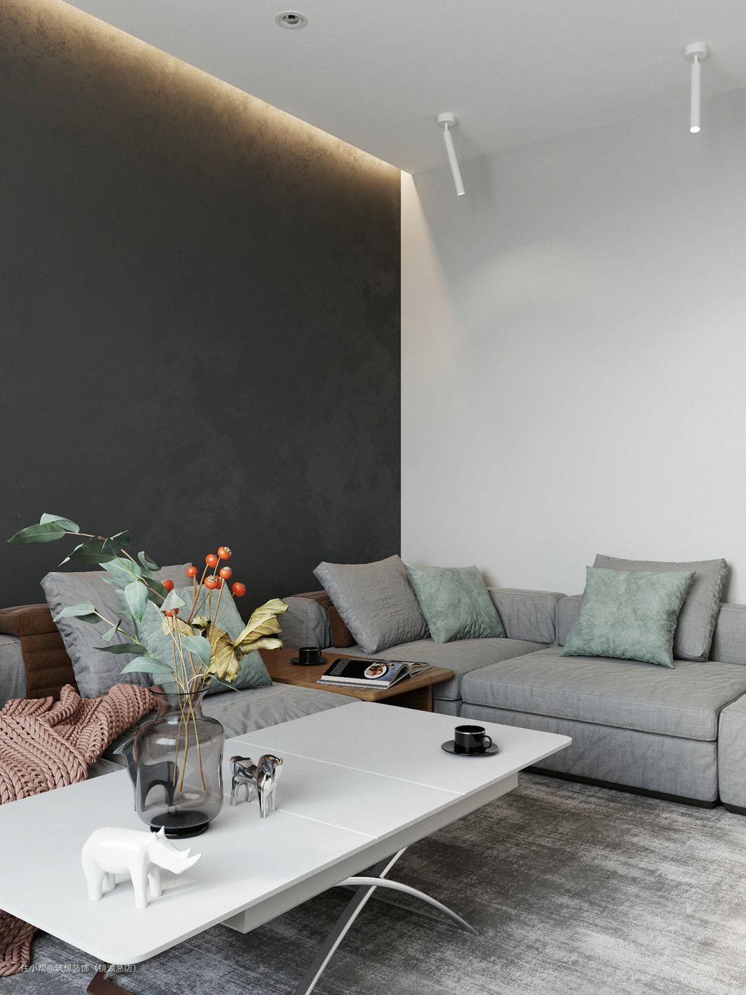 本案例墙体和地面均采用深色调,所以软装和家具可以搭配浅色和亮色的,整体和谐统一,对比效果也非常明显。