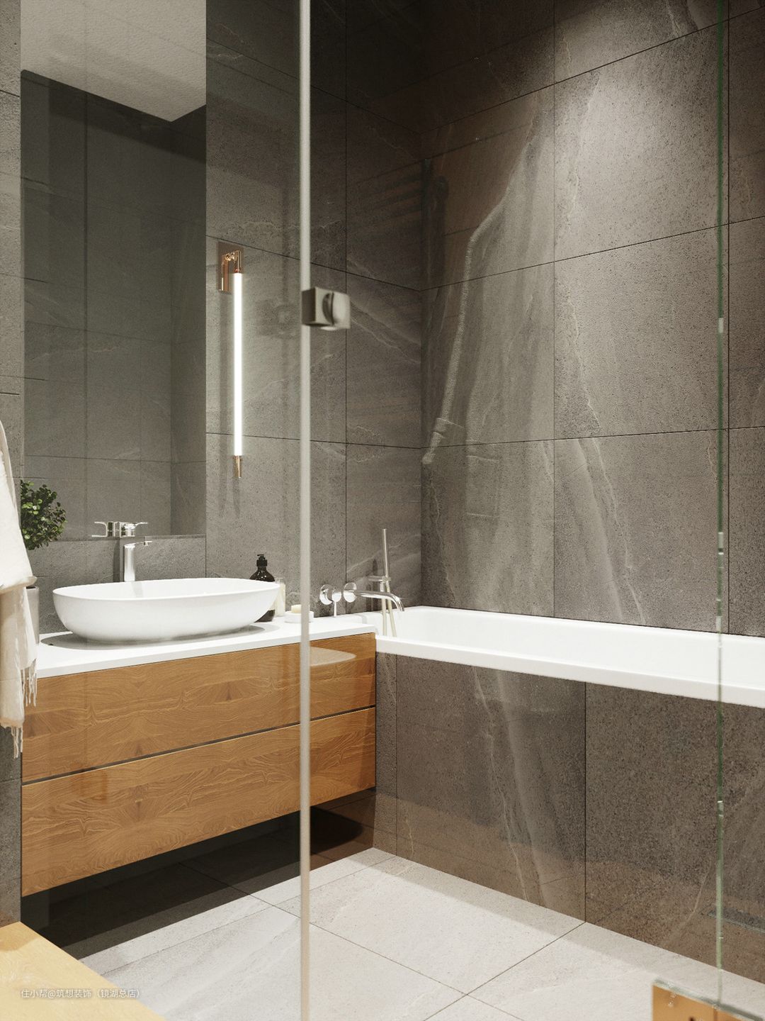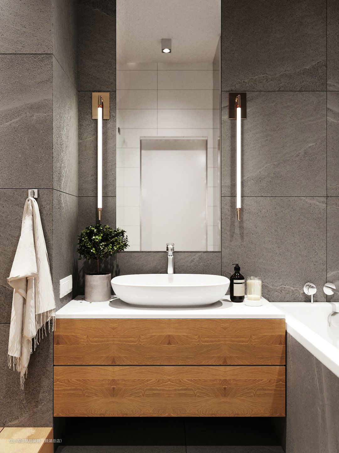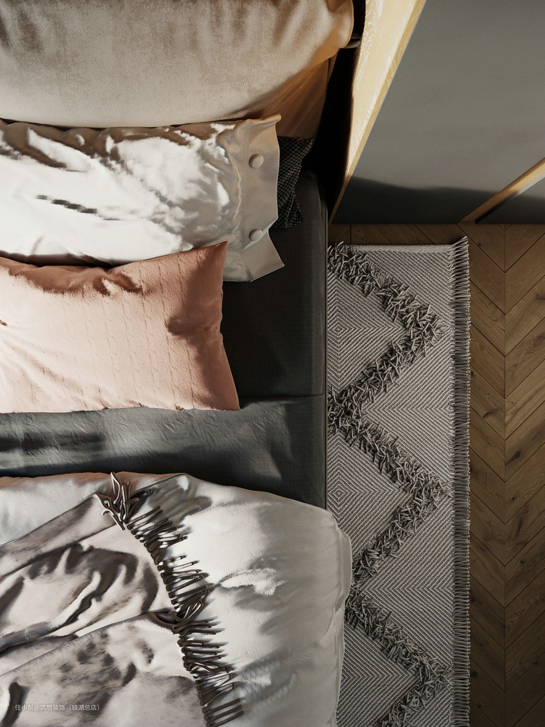 本案例墙体和地面均采用深色调,所以软装和家具可以搭配浅色和亮色的,整体和谐统一,对比效果也非常明显。
