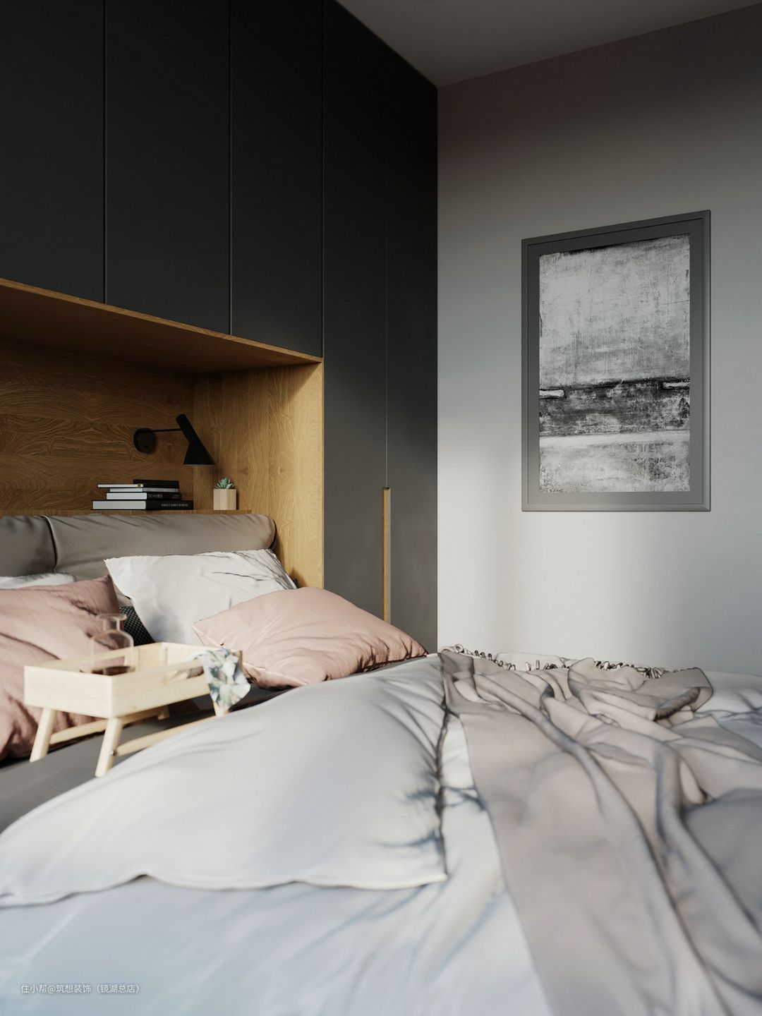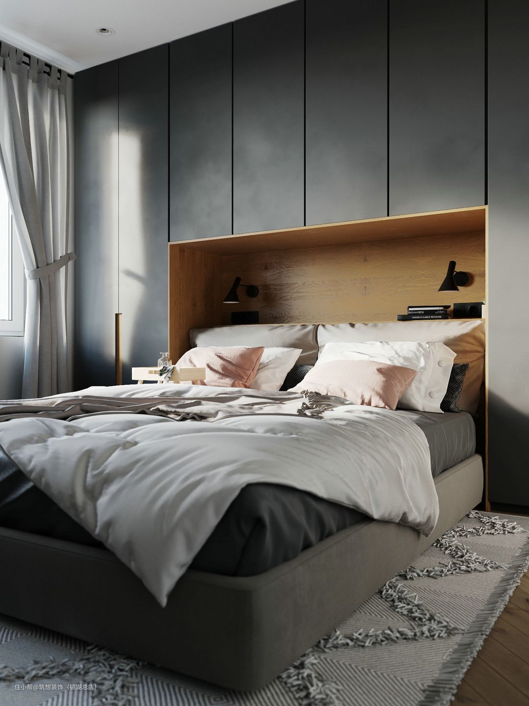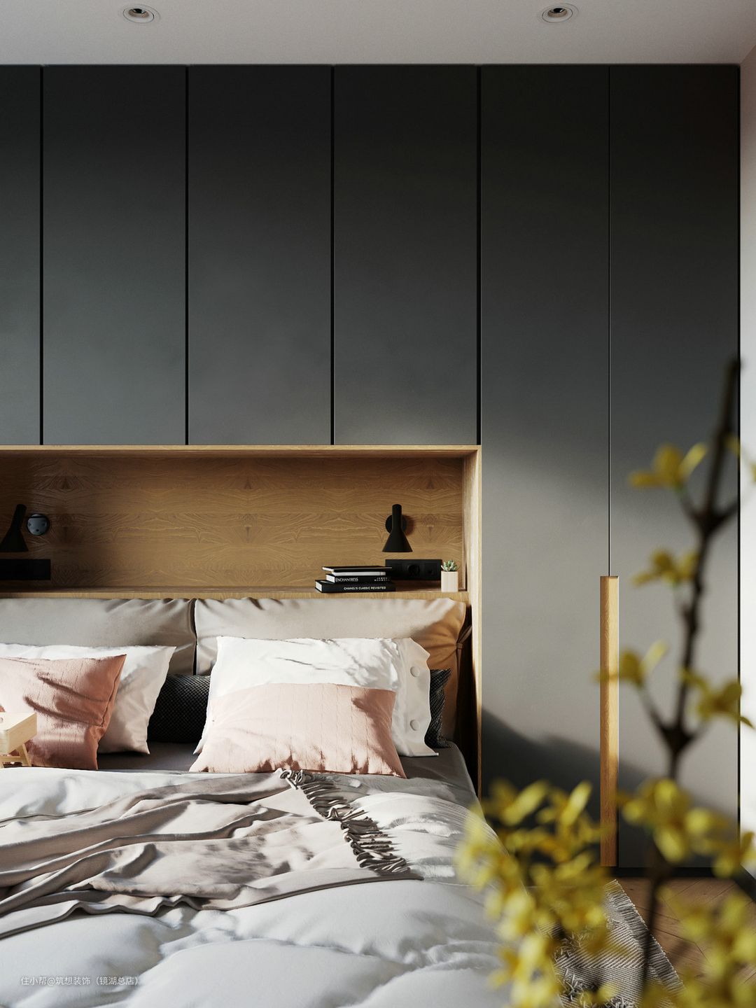 主卧床头嵌入衣柜,上面做吊柜+隔层板,方便放小物件,满足了强大的收纳空间,同时留给卧室更充足的自由活动空间,整体看起来也会非常大气宽敞
