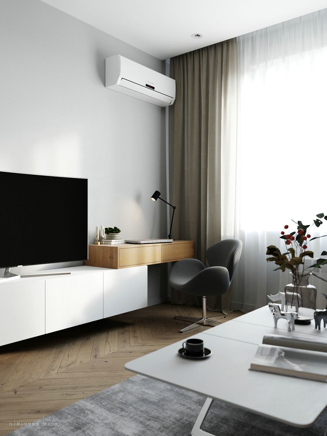 电视背景墙增加了书桌功能,一个人下班回家,可以有自己写写画画的地方