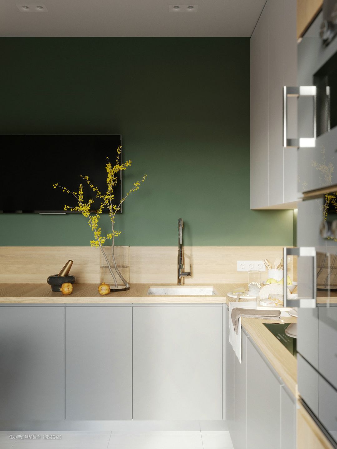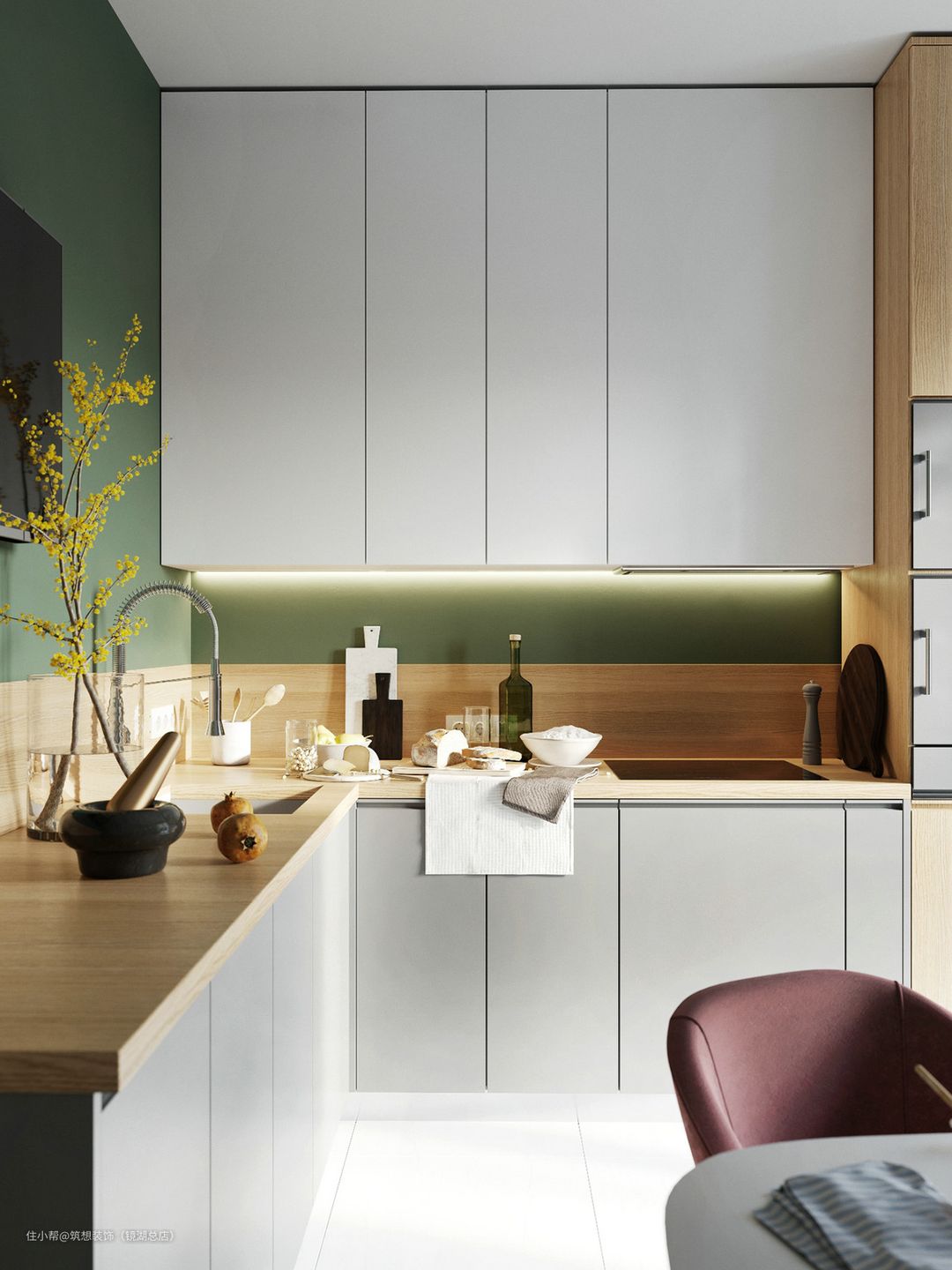 小L型厨房,墨绿墙搭配线条灯,有非常不一样的效果,氛围感很浓。洗手池的上面做了极简吊柜设计,增加收纳,不担心碰头
