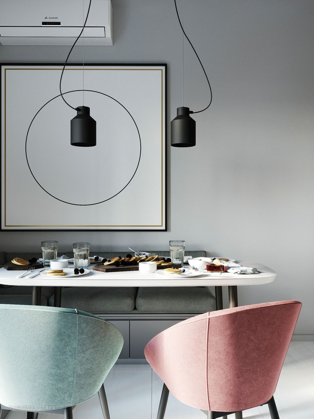 餐厅与厨房共用一个空间,跳色座椅的应用,增加空间的灵动性