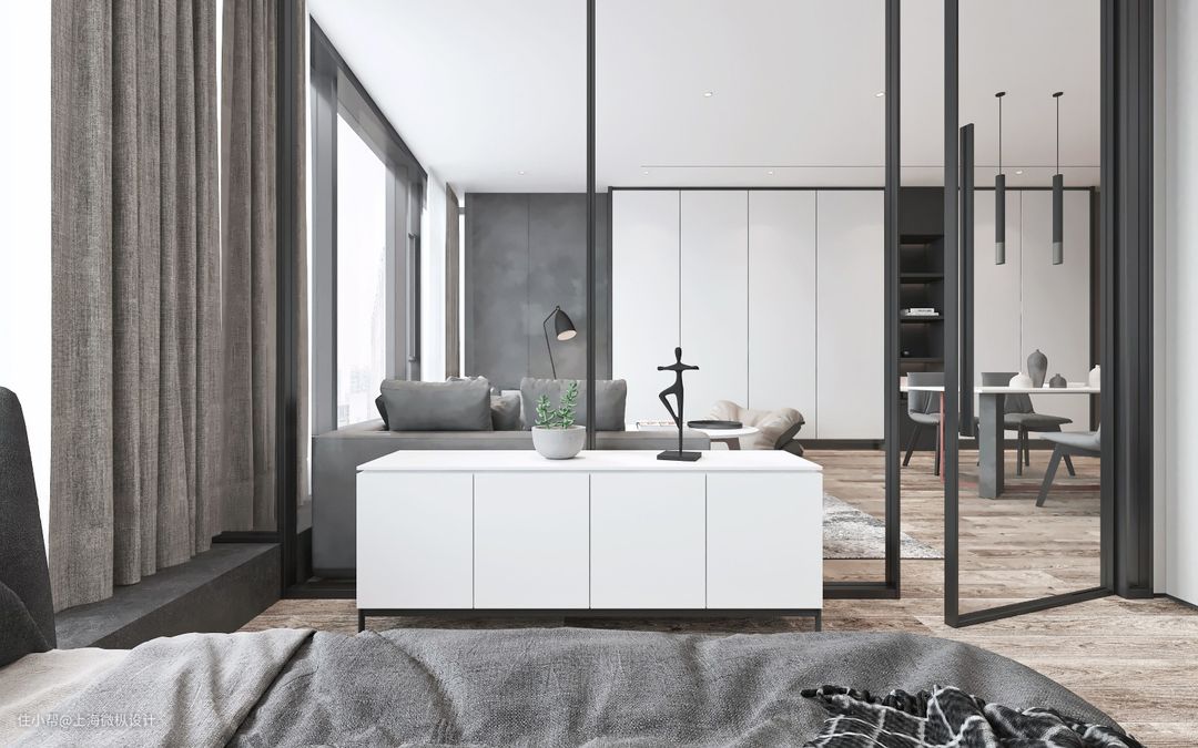 次卧空间相对较小整体色调也为灰白为主调,床和书桌都为靠墙设计使空间使用率达到最大