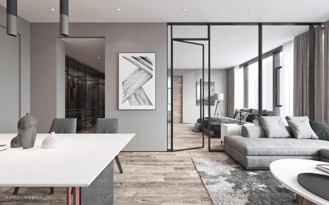 紧邻客厅卧房则透过清玻璃烤漆门,区隔内外之余亦拓展无尽视野,借此明亮轻盈调性放大空间感;兼具廊道功能的独立更衣间,透过轻透玻璃结合灰泥背墙,再辅以崁灯照明缔造光影流动,塑造有如精品展示艺廊质感;卫浴采用波纹大理石串连干湿分离,平衡深灰壁砖沉厚调性。