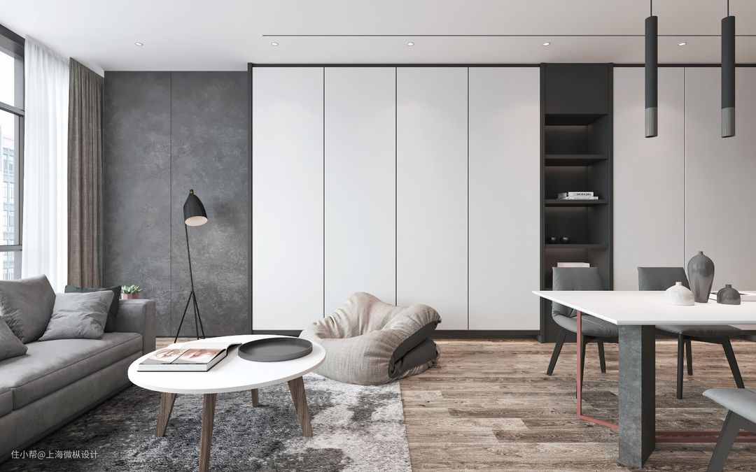 客餐厅设计灰色桌椅搭配白色大理石桌面时尚简约,右侧满墙式收纳柜