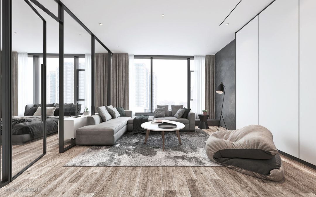 整体地面铺排奔放肌理木纹地板,立面选用简白落地储放柜筑起完善收纳机能,并于客厅墙面涂绘深灰手感水泥粉光,堆叠层次亮点。