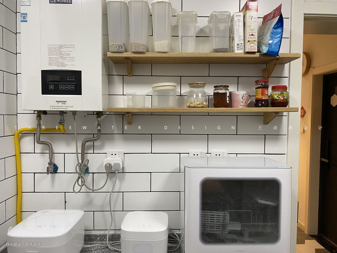 厨房的另一侧也做了隔板,收纳常用五谷食材,下方是台上洗碗机每周用一次,主要给餐具杯子消毒,旁边两个是小米的电饭煲,一个蒸米饭,一个熬粥。
