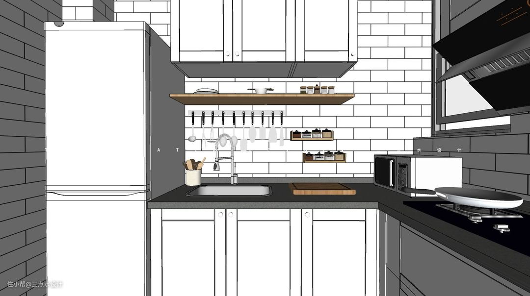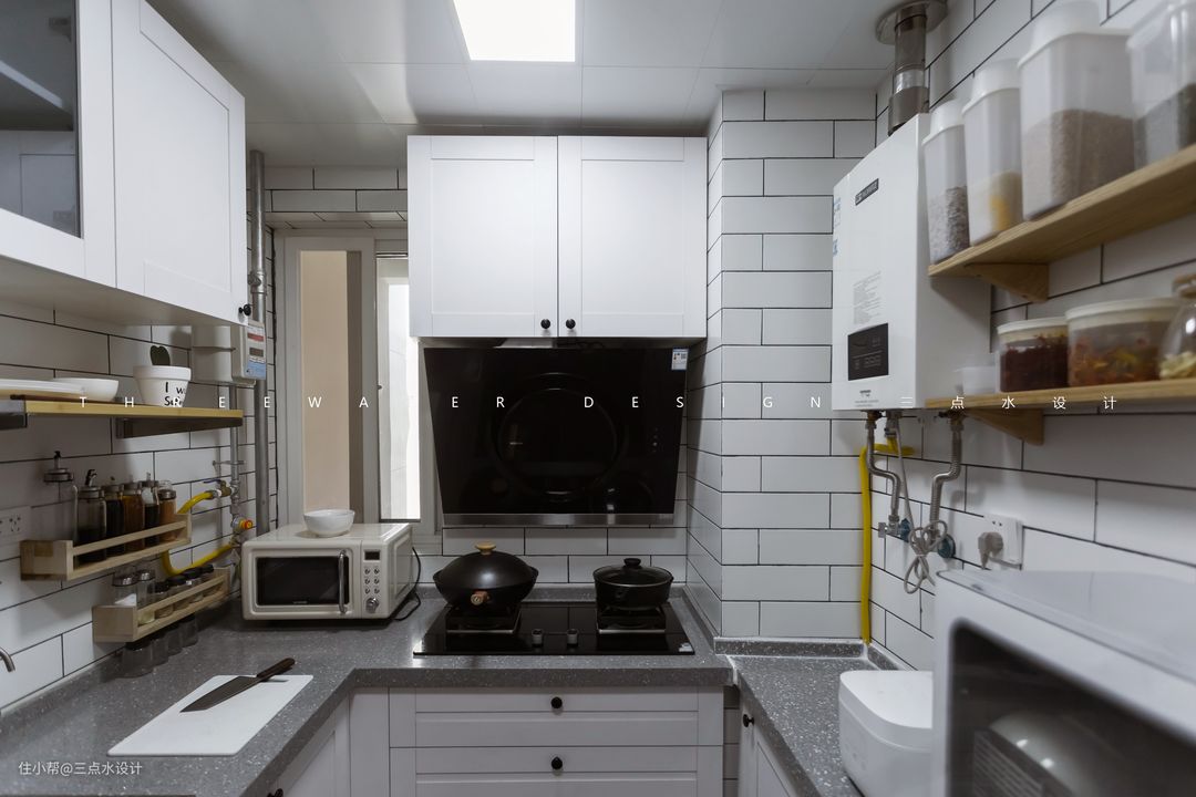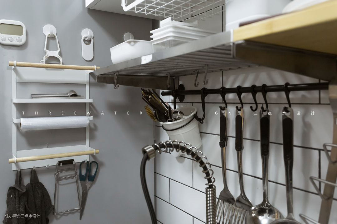 厨房嘛,就是要有乱糟糟的烟火气息,水槽设计在冰箱旁边,拿→洗→切动线相当流畅。厨房收纳按照常用物品,顺手物品,备用物品做了三层收纳。 分别为吊柜放置备用物品,中部墙面放置顺手物品,底部橱柜放置常用物品,利用立体空间,保证操作台面干净整洁,用起来才能游刃有余。