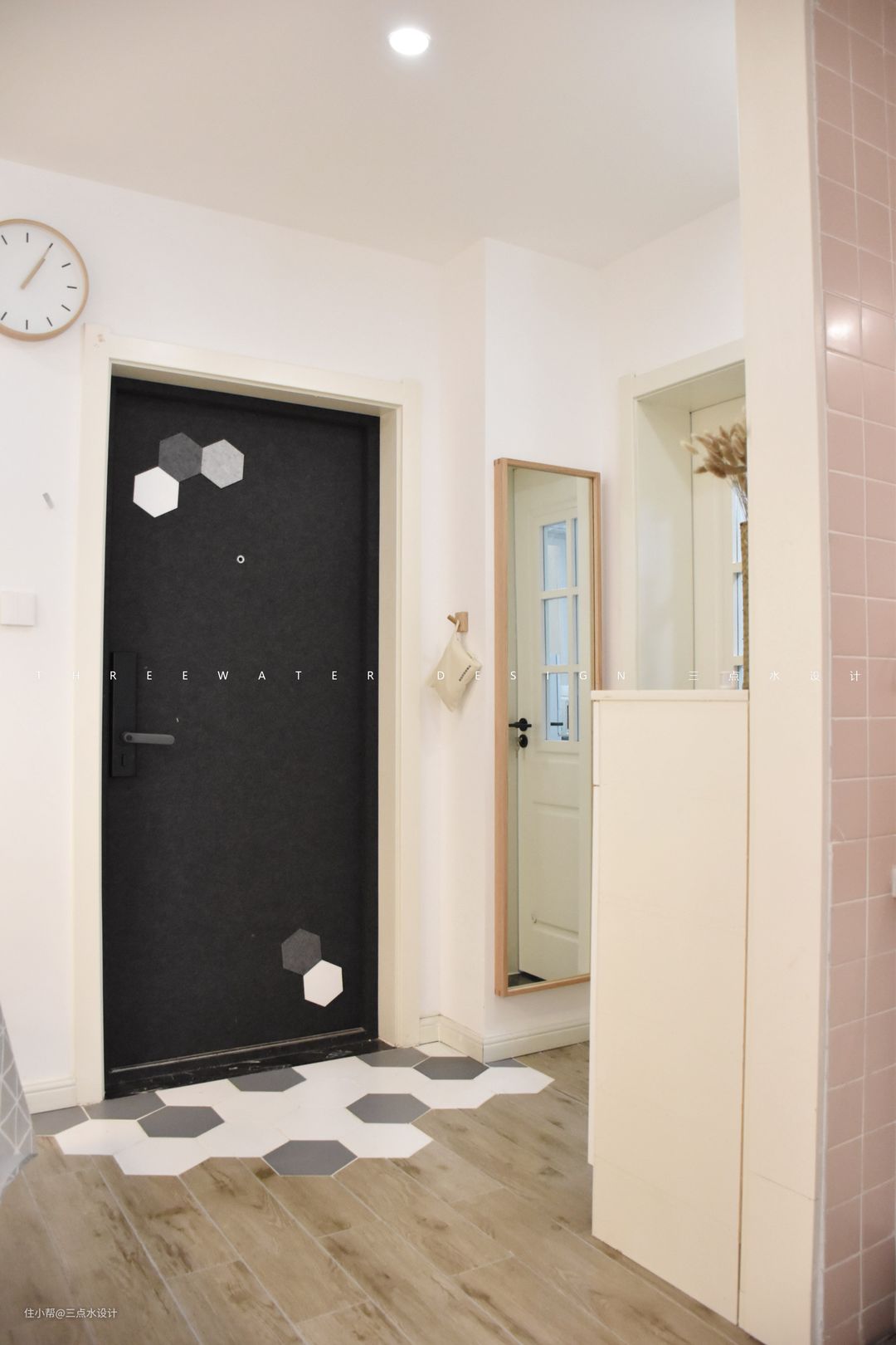 用黑色毛毡改造了猪肝红防盗门,落脚位置用小花砖与木纹砖错落拼接,与六边形小毛毡呼应,增添空间生气,同时规划出玄关的位置。 设计师在门侧边利用空间缺陷,挂了一面试衣镜,在满足使用的同时,弱化了墙体体积感。