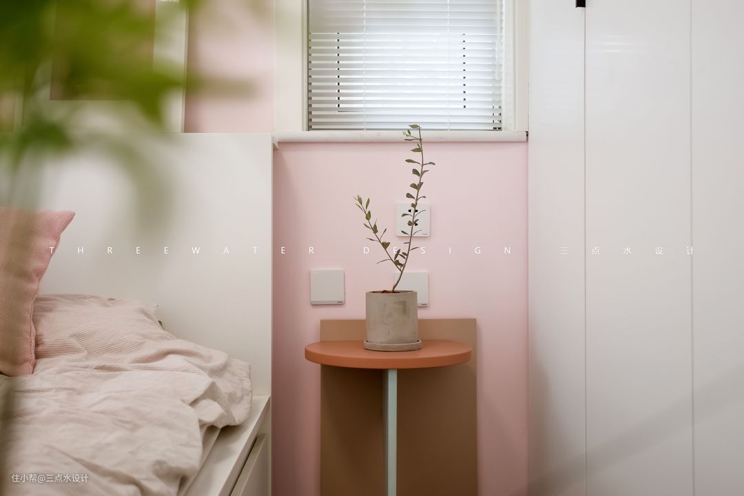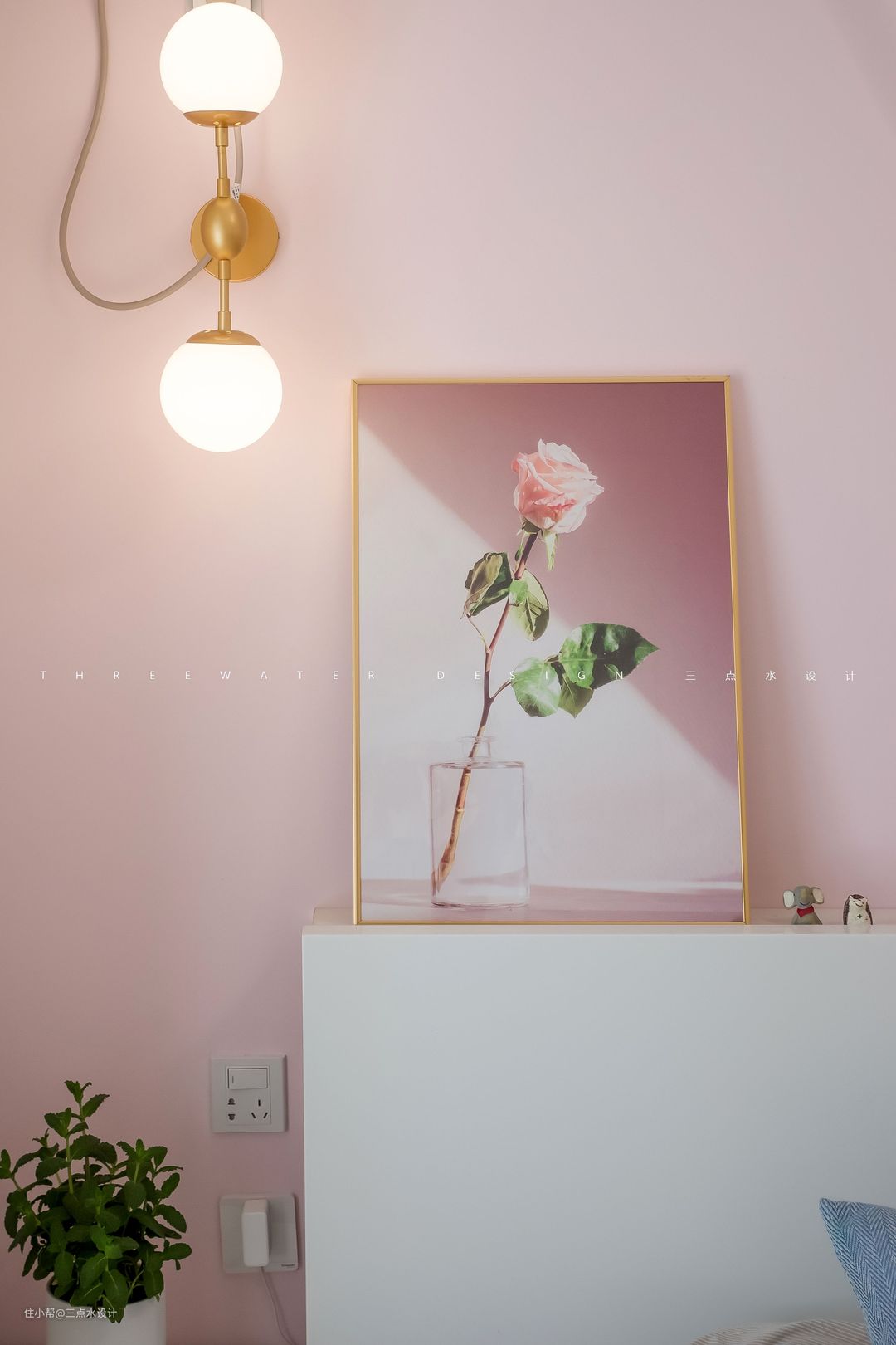 进入主卧的一瞬间少女心瞬间炸裂╰(*°▽°*)╯,粉色的床头像极了初春新开的樱花,简约与浪漫两种气息在主卧空间和谐共处。 劳累繁杂的工作之余,家是一个避风港。在工作之外,我们还需要一个全是身心的放松的空间,那便是卧室。