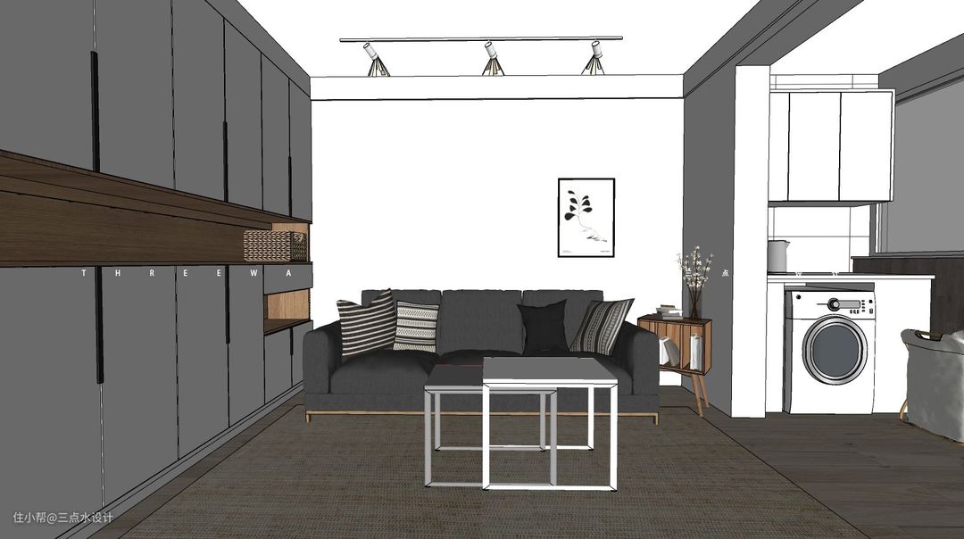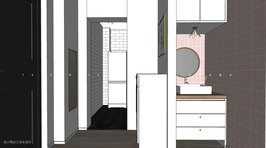 模型图👆 鞋柜背后是卫生间干区,用台盆外移法,得到了完全干湿分离的卫生间,即使是上班早高峰,也不会出现上厕所堵车的状况。