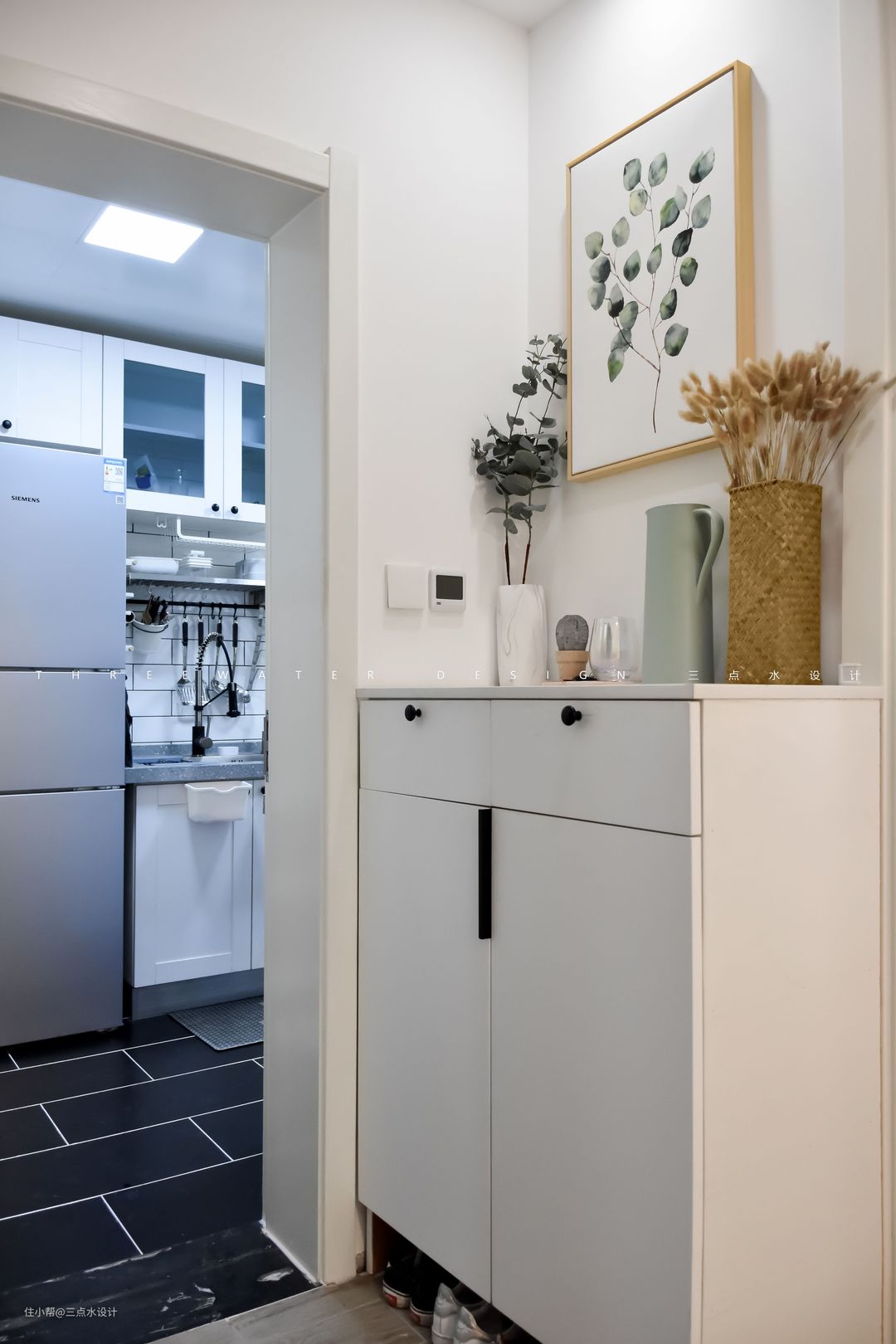 原本房间没有玄关,进门处逼仄狭窄,且小小的空间要容纳餐厅与玄关两大功能,还是蛮挑战的。为了增加门厅功能,新建墙体留出鞋柜的位置,对调玄关餐厅,让餐厅与厨房,入户门与玄关形成 I 字动线,保证回家时满心欢喜,离家时神清气爽的状态。