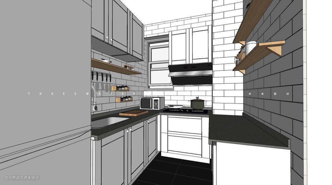 屋主是一个爱做饭的胖子,对厨房功能要求非常高,合理顺手的收纳空间、高效整洁的操作台面,便捷舒适的烹饪工具这些一个也不能少。 利用空间做了更大台面的U型厨房,按「冰箱取菜→洗→切→做菜→放菜」的动线来规划设计。