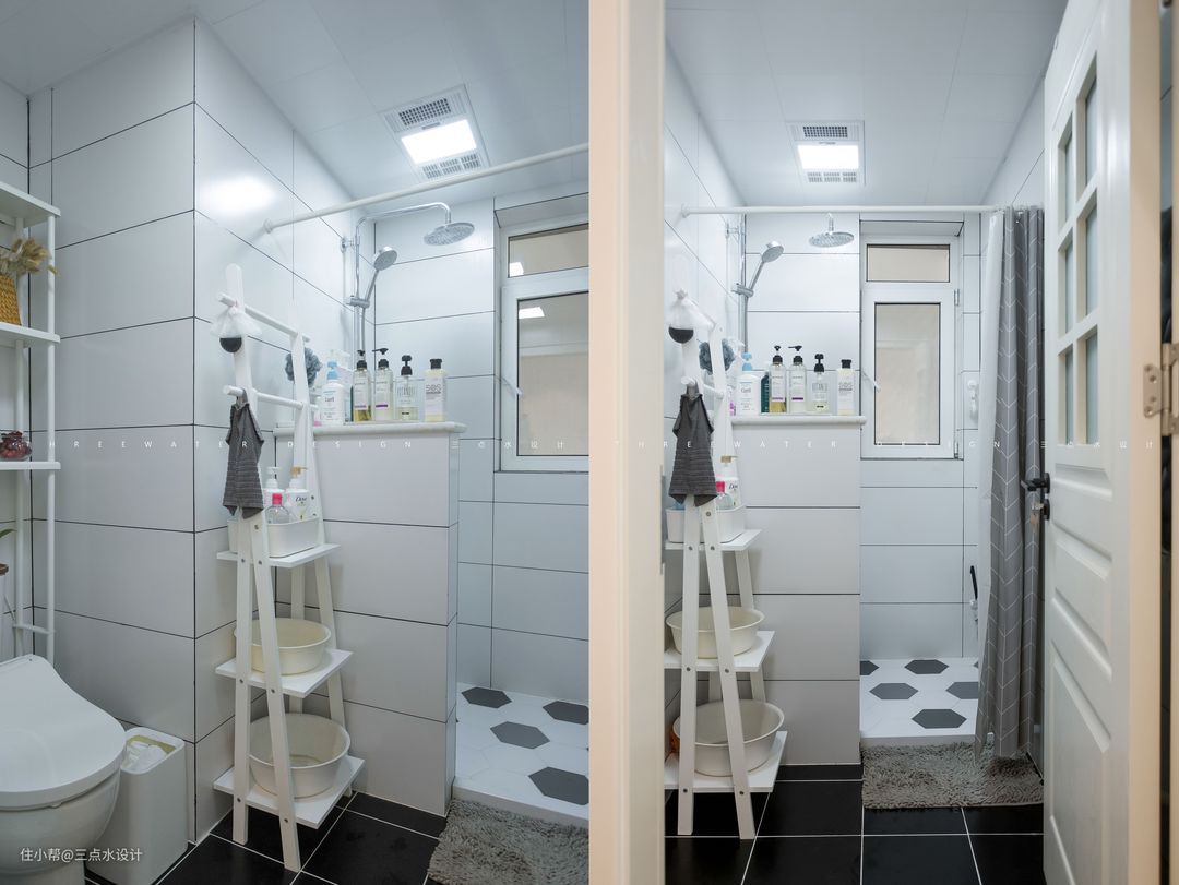 新建高度1200mm墙体做淋浴区隔断,搭配浴帘,洗澡时马桶区几乎无水渍;墙体上可放置常用的洗浴用品,拿取方便。利用多出来的拐角定制置物架,收纳脸盆及洗浴备用物品。
