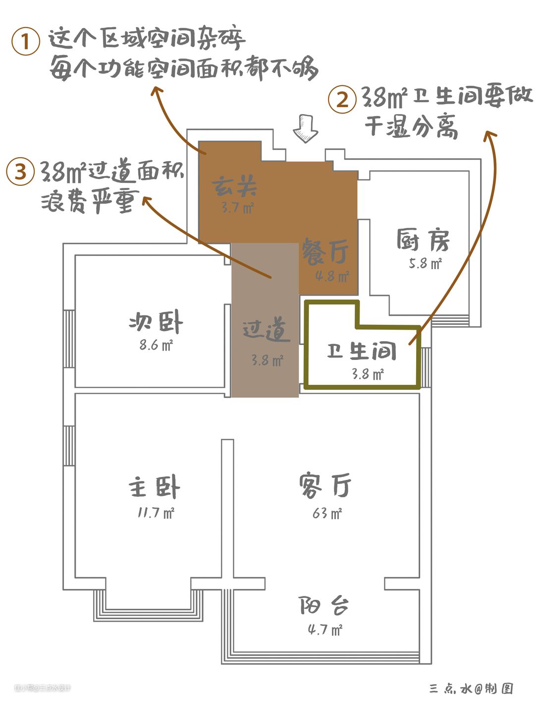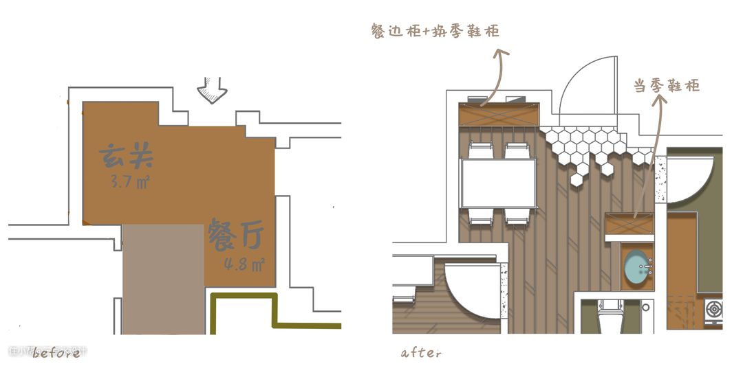 改动位置: 1.卫生间台盆外移,做完全干湿分离卫生间 2.入户门正面新建墙体,留出鞋柜的位置,划分出台盆空间 3.餐厅玄关对调位置,利用过道空间放下一张四人餐桌