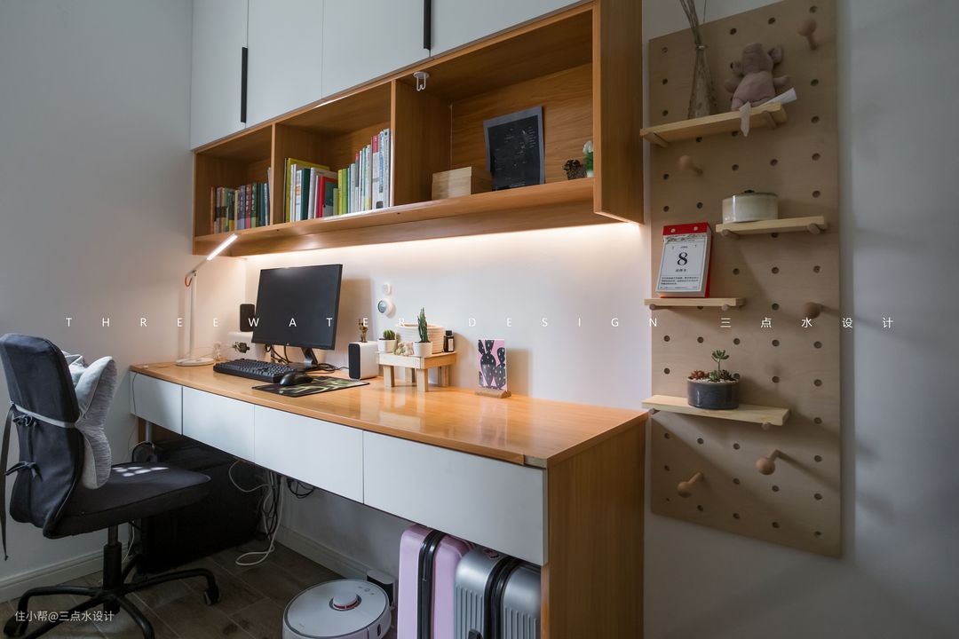 书房以榻榻米的形式整合,兼顾临时客房与书房的功能,洞洞板主要用来收纳一些小物品,美观又实用。
