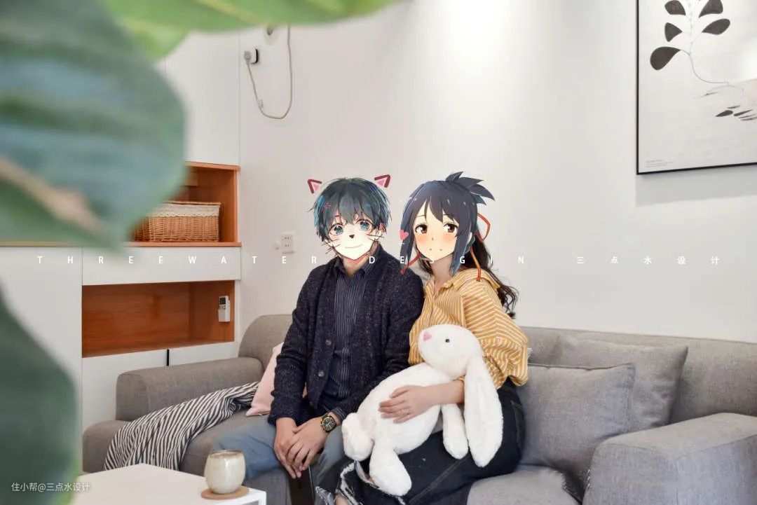 在沙发的左侧,定制了顶天立定收纳柜主要解决公共区域的收纳问题,比如猫粮、女主人的画板及颜料、男主人的DIY工具、日常囤的纸巾等生活杂物。