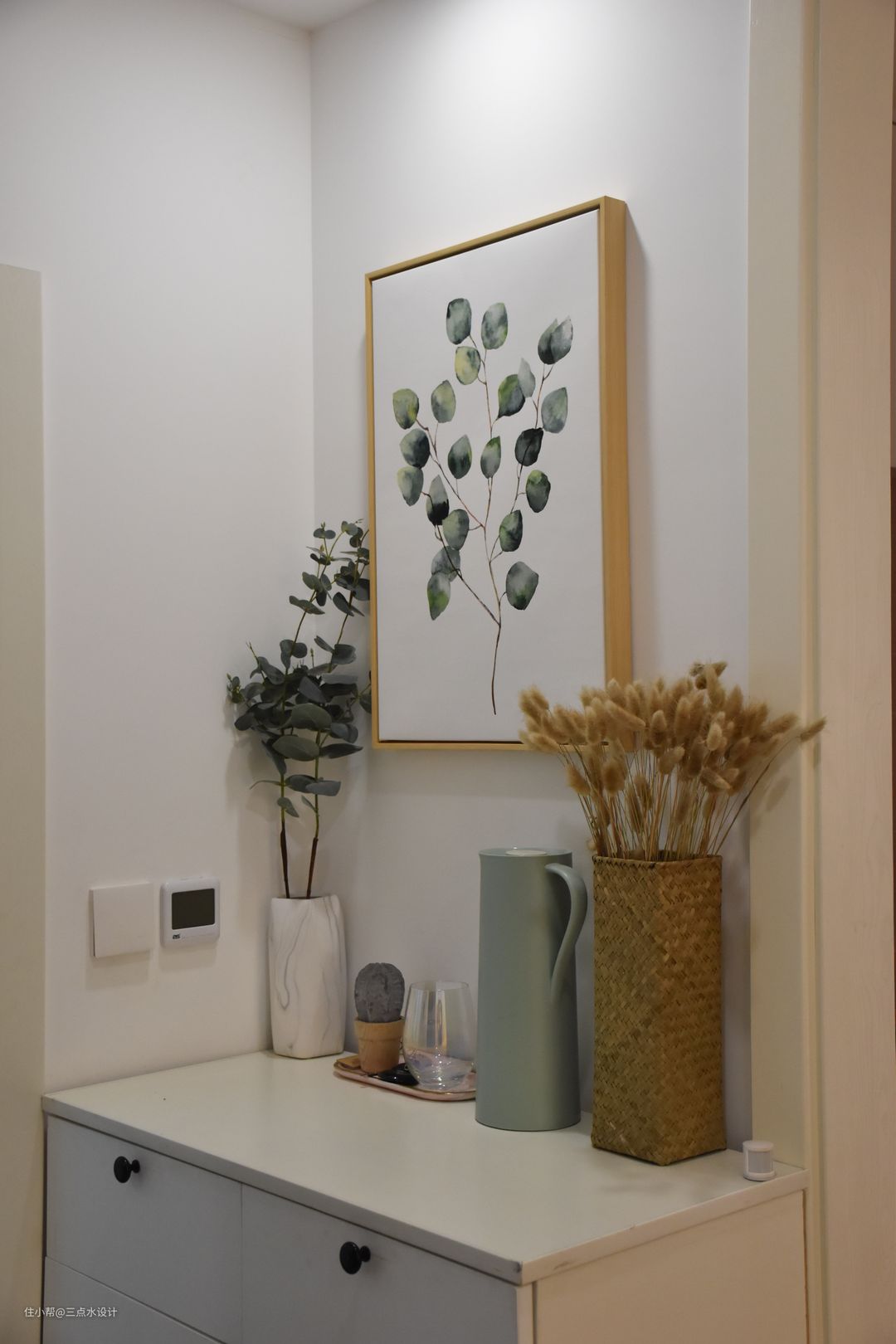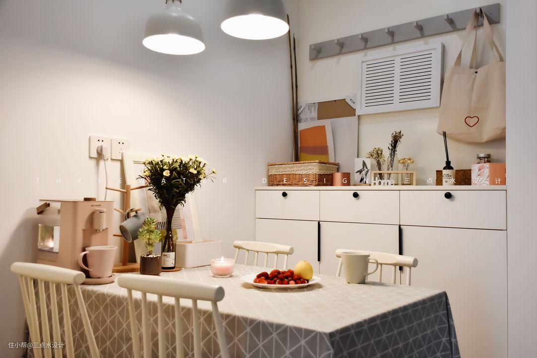餐桌旁边的收纳柜可充当餐边柜,放置临时餐具;下部空间用来收纳换季鞋子,缓解玄关柜收纳压力。