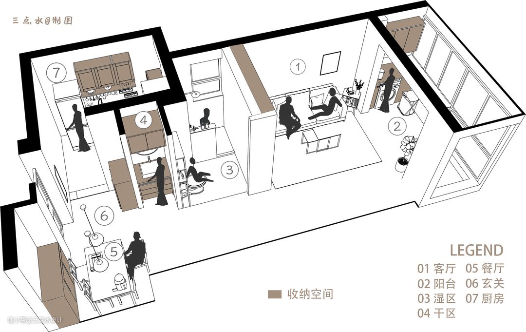 收纳及动线分析图,除去卧室我们可以通过轴测图看清楚一家人在每个空间的生活状态,通过对空间功能的重新划分,依据就近原则对空间进行收纳设计,正在做到麻雀虽小五脏俱全。
