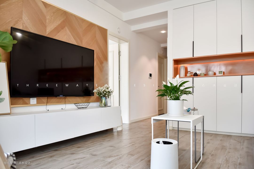 电视背景墙采用木地板鱼骨拼,避免空间过于苍白,电视柜下部悬空方便扫地机人轻松进入,视觉上也轻盈很多。