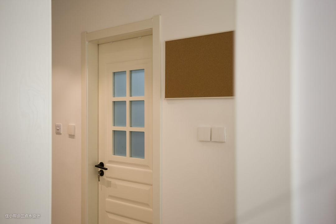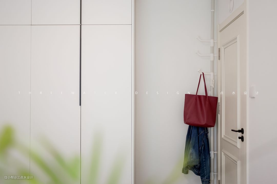 主卧门后空间。生活场景:在入睡时,我们会发现脱下来的衣服没有地方放,或是扔在飘窗上,或是堆在床角,利用门后做收纳,解决随身衣物无处安放的问题。