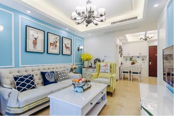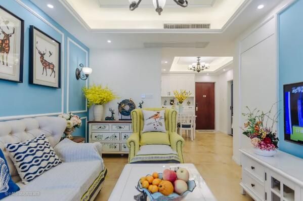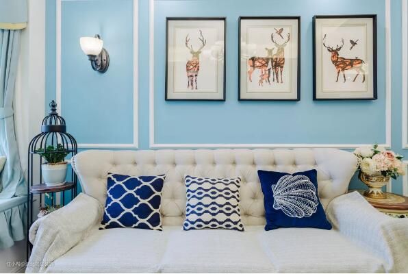 沙发背景墙是蓝色的乳胶漆背景墙,白色的石膏线,蓝白经典配色清新舒适。