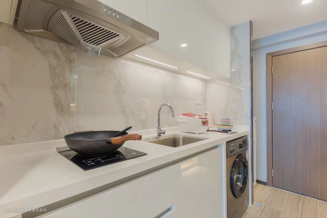 洗衣机就嵌入了厨房的橱柜里面,设置了柜下灯,在操作的时候不会出现暗面。
