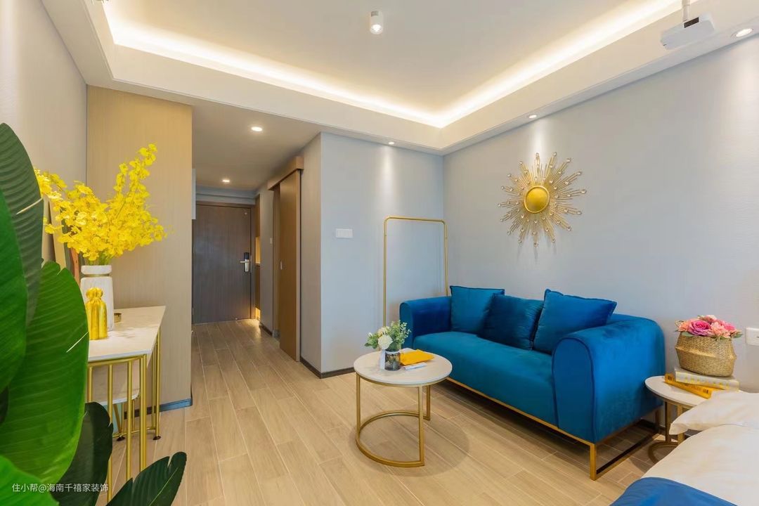整个空间呈明亮素雅的舒适色调,沙发采用了跳脱的蓝色,提升整体的色彩饱和度。不会让空间千篇一律毫无生机。
