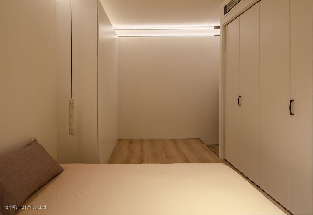 卧室的两面墙都做了衣柜,进门地面抬高处理,床内嵌于地台之中,整体简洁有序,一气呵成。