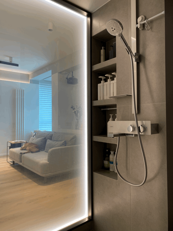 洗手台左侧的淋浴区,墙面材质为仿水泥砖,质感高级,花洒旁边设置壁龛,正好可收纳洗漱用品,并且采用了电动雾化玻璃作为与客厅的隔断,既解决了原本暗卫采光不便的难题,又能很好地保护隐私。