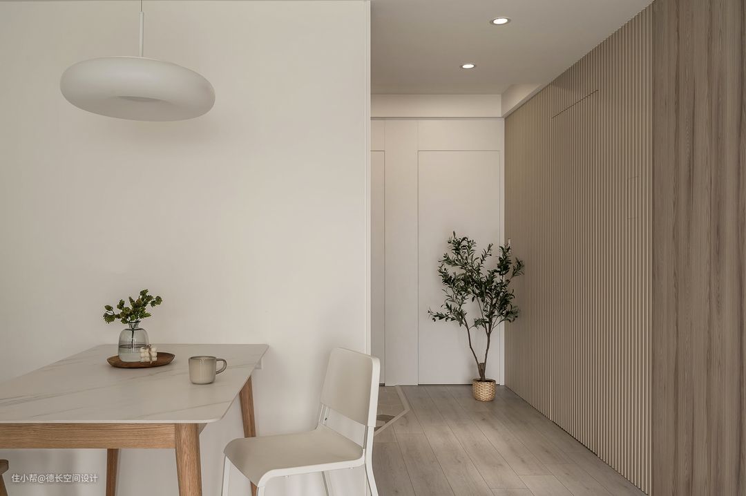 餐桌后方同样定制一组通顶柜,提升餐厅区域的收纳功能。